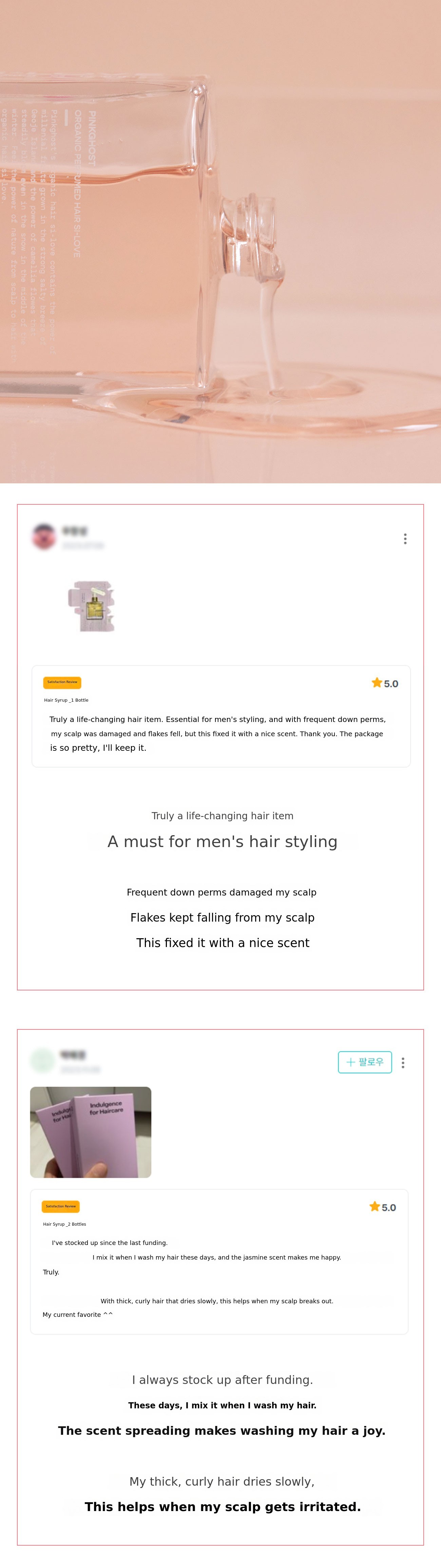 It's no exaggeration to say I've tried every hair product for young people at Olive Young, but among all those hair care products, there wasn't a single organic specialty brand.Maybe because I was born and raised in Geoje Island, where natural and organic ingredients were a given, in the Korean market where 'effectiveness is more important than ingredients' is the norm,I wanted to prove that 'ingredients are as important as effectiveness.' With just that stubborn determination, I am still running Pink Ghost.