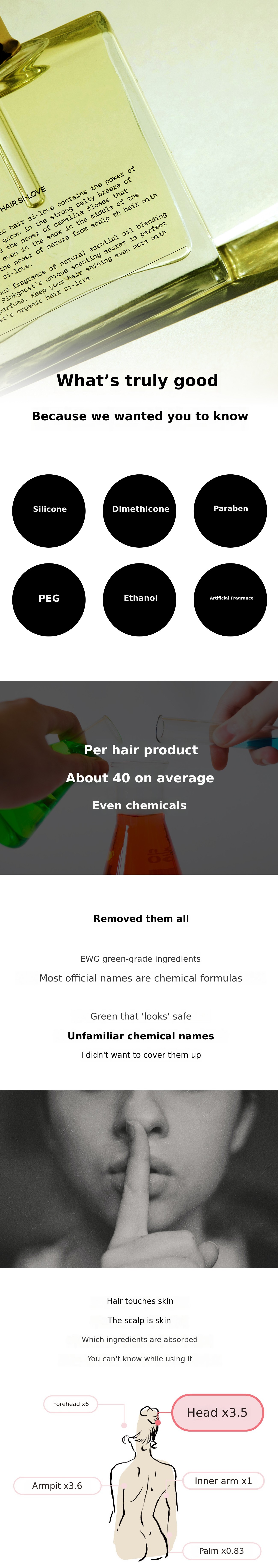 Even though I clearly applied just a tiny amount,My hair would get greasy every time, Existing hair oils that made me blame myself, wondering if my hands were the problem. Heavy silicone forms an artificial layer on the hair surface, giving only a temporary softness, and the unabsorbed oil mixes with external impurities or the oil from hands, making the hair greasy.