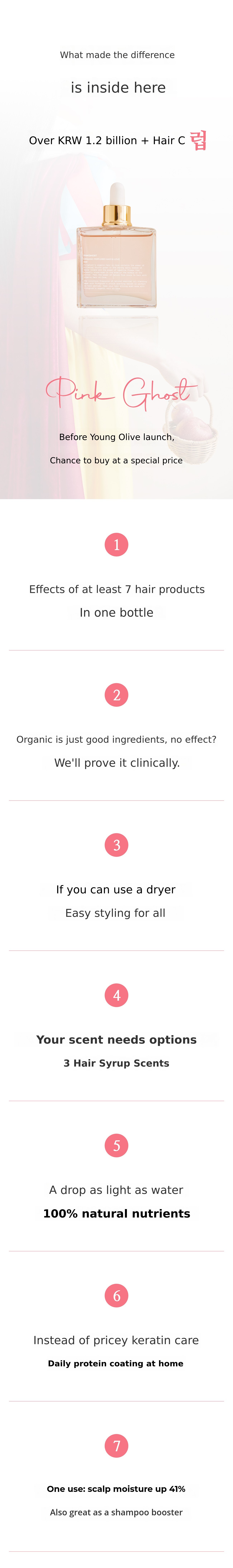 If it's Pink Ghost, which has never lost its throne as the No. 1 hair oil on Wadiz with organic hair syrup, it can break that prejudice. Until now, we couldn't prove the value of our hair syrup through human application tests due to production costs, But as we prepare to launch at Young Oliv, We decided to take a big step and prove ourselves with 'numbers.'