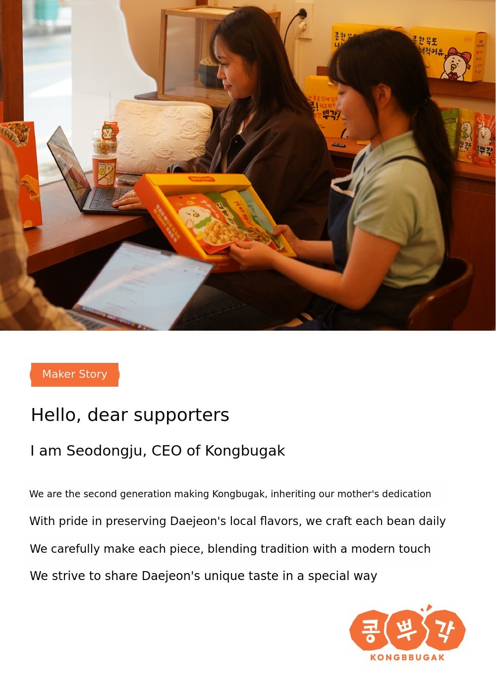 Hello, this is CEO Seo Dong-joo. We are the second generation to make soybean chips, inheriting the taste and dedication of our mother. With pride and a deep sense of duty to preserve Daejeon's local cuisine, we craft each piece with care. We reinterpret traditional flavors with a modern touch, striving to make the taste of Daejeon even more special.