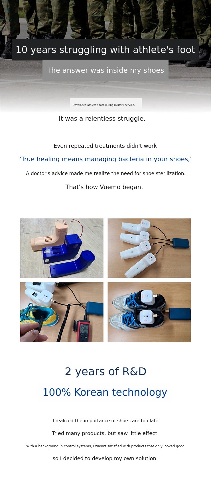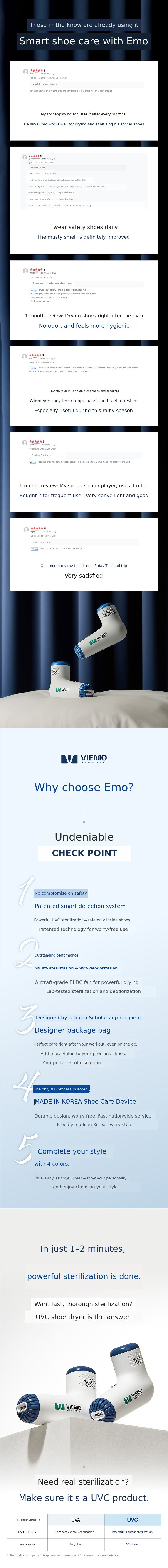 Based on my technical expertise from participating in the development of various products such as L* Electronics (humidifiers, air purifiers, ion sterilizers, gas stoves, etc.) and D* Electronics camping air conditioners, I have developed a portable smart shoe care device proudly MADE IN KOREA. The know-how I accumulated over 15 years of working in electronic product development has been a solid foundation for developing VIEMO.