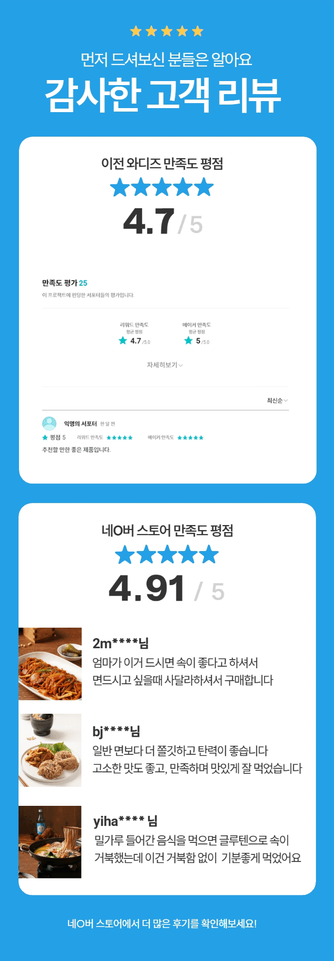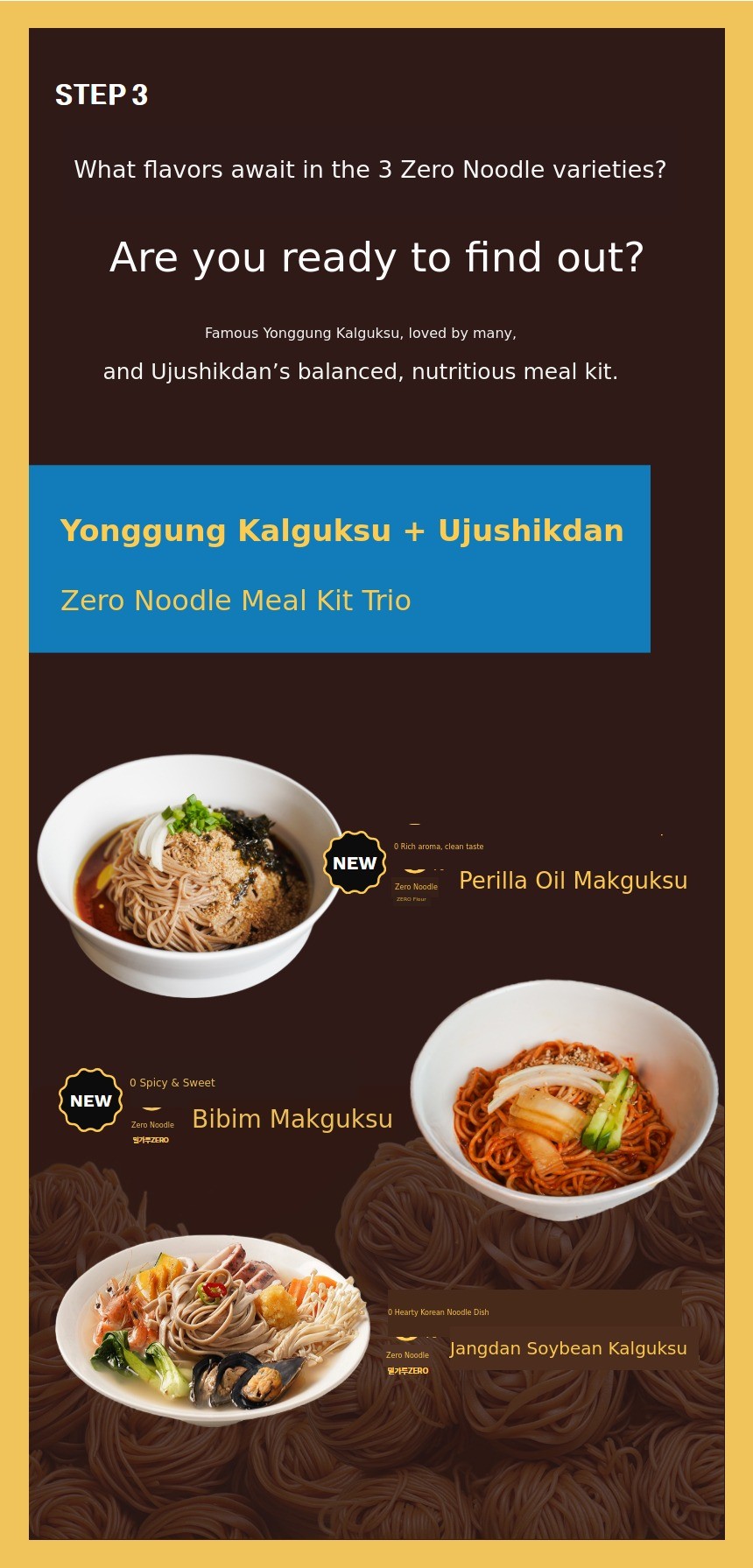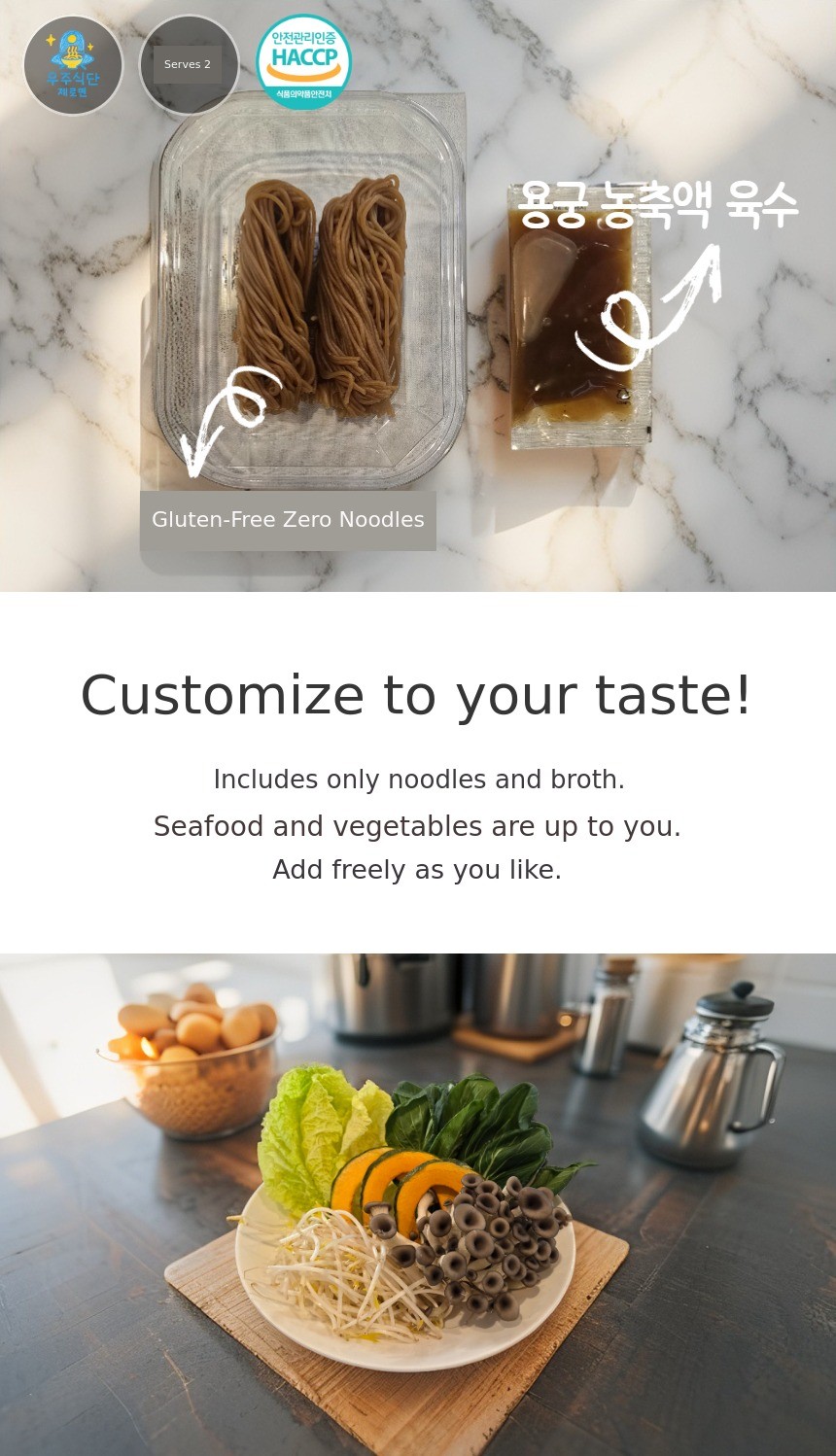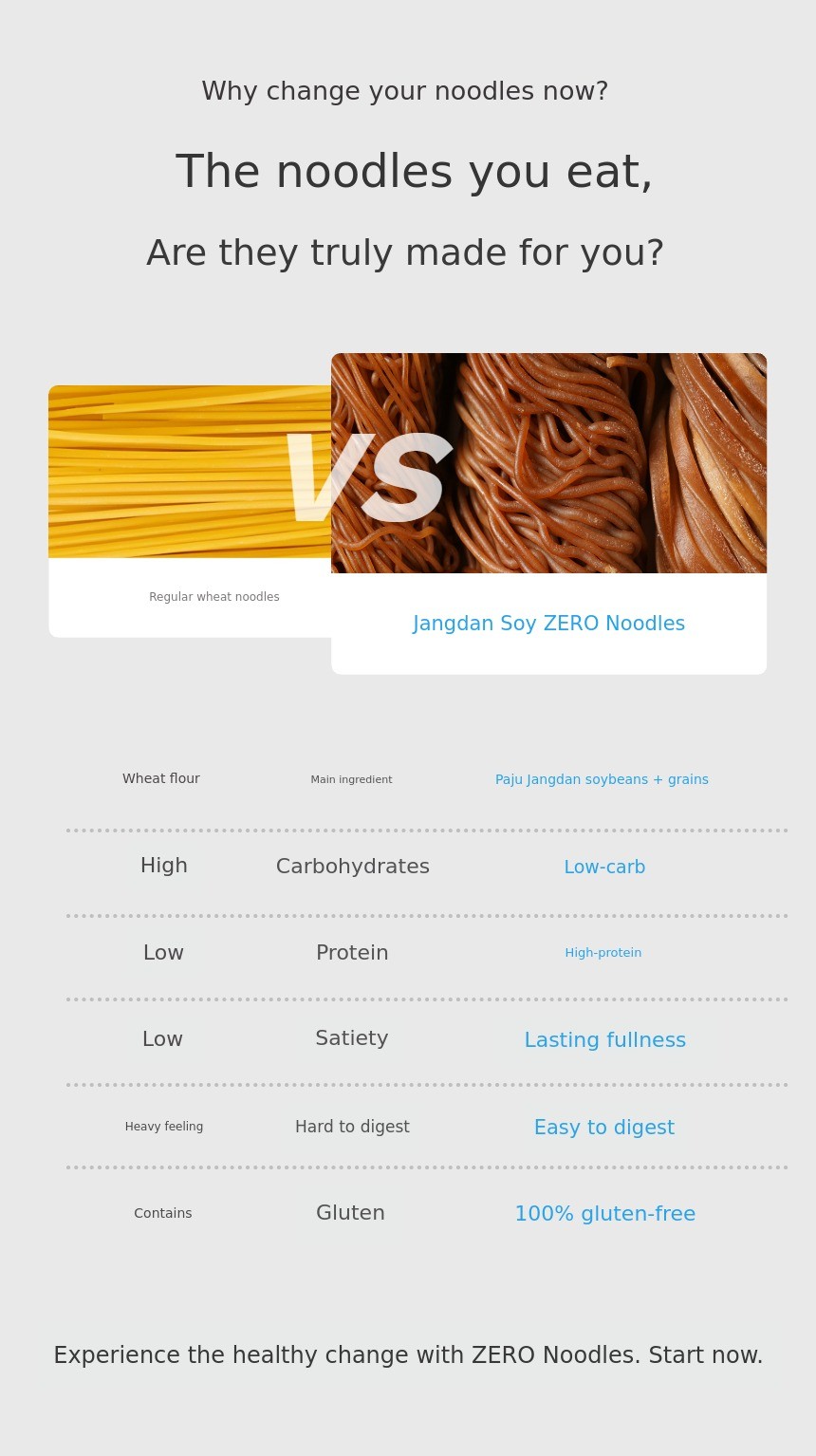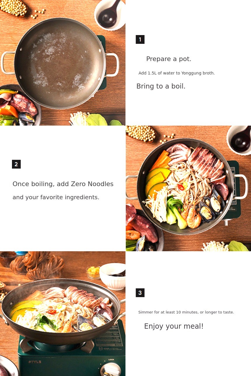 Through our previous Wadiz funding, so many people experienced Yonggung Kalguksu. With gratitude in our hearts, this time, with a more diverse lineup, we have returned.In addition to the three types of Zero Noodles (Kalguksu, medium, and thin noodles), we are also introducing Yonggung Kalguksu andPerilla Oil Makguksu, Bibim Makguksu Meal Kit as new offerings. We have come back more complete so you can enjoy healthy meals all year round. We will help complete your healthy dining table. Thank you.