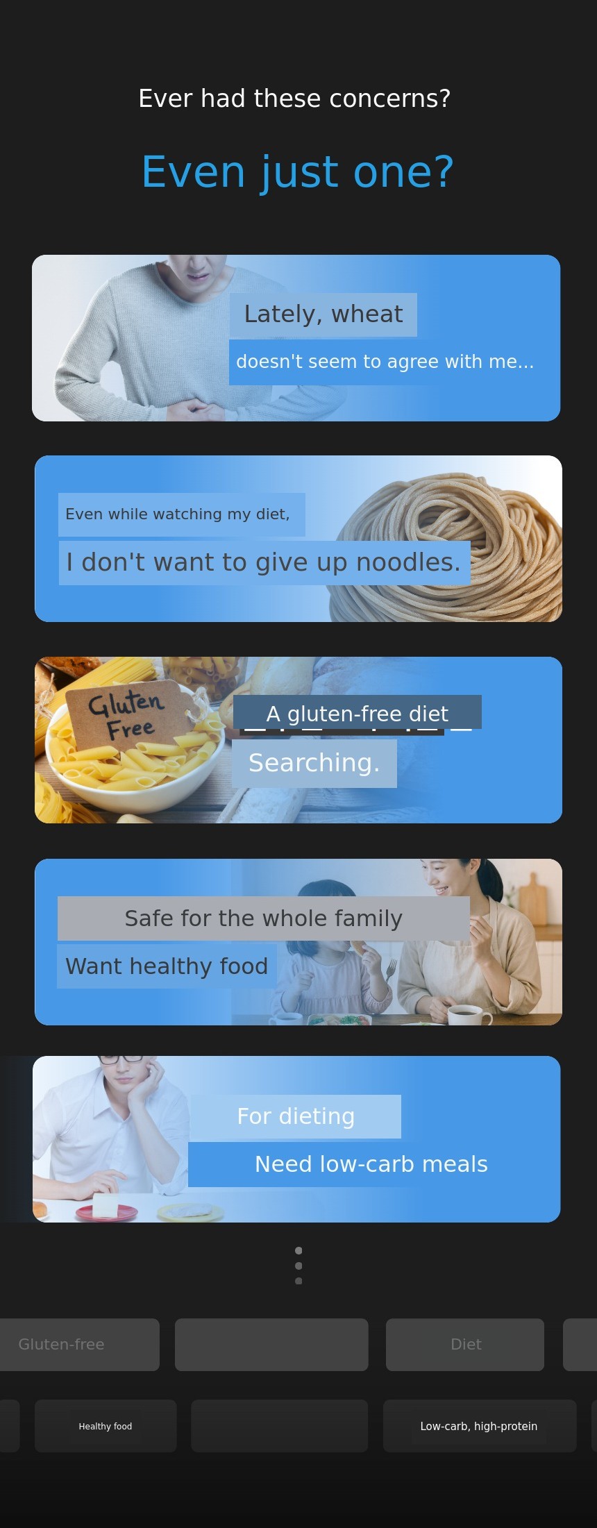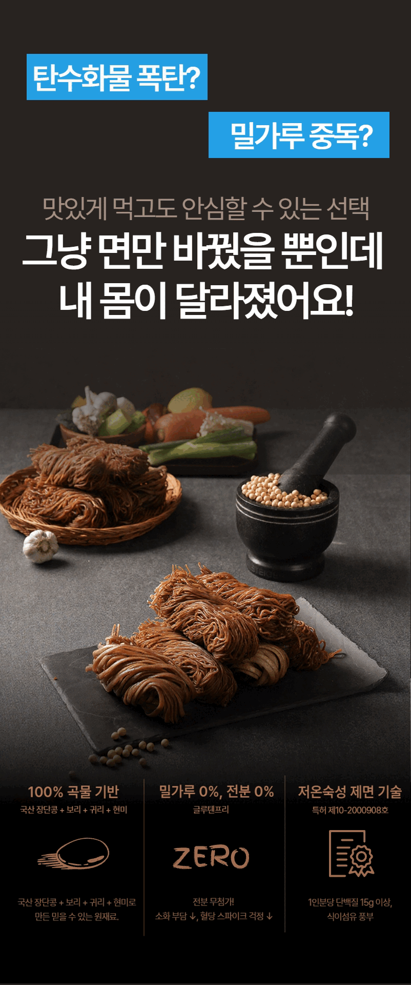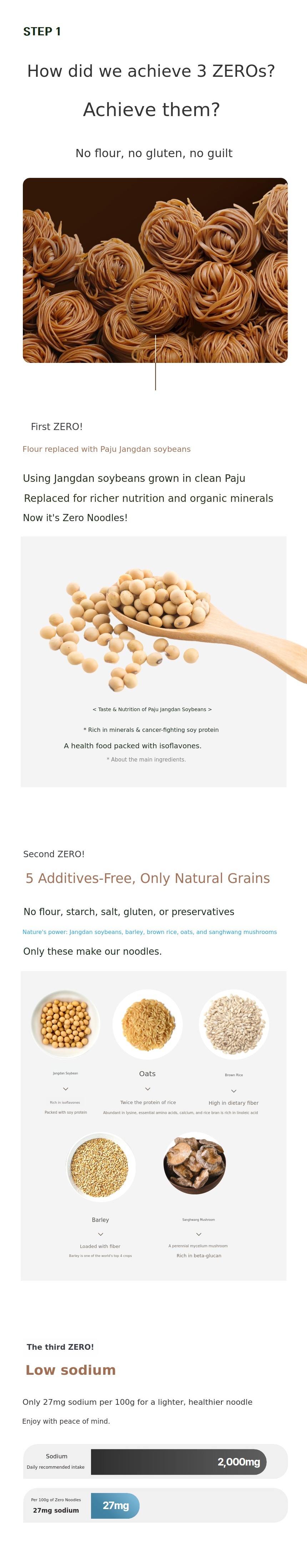 We strived to create noodles without any added starch, flour, gluten, or preservatives, and after hundreds of experiments, we discovered the golden ratio of five grains: Jangdan soybeans + barley + brown rice + oats + sanghwang mushrooms. Healthy yet chewy, the miracle noodles.Patent No. 10-2000908 were completed.
