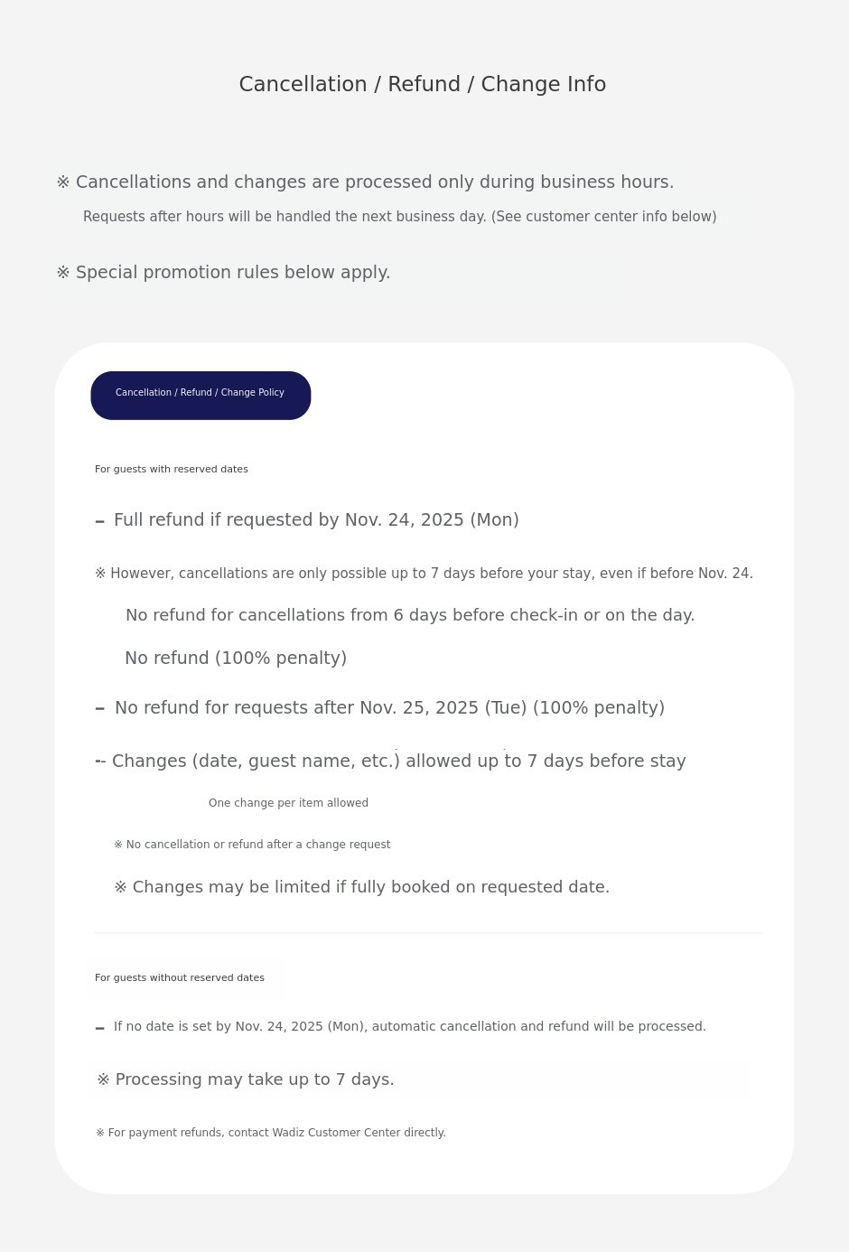 β» However, no refund is available for cancellation/refund requests made from 6 days before the stay date to the day of the stay (100% penalty). - No refund available for cancellation/refund requests made after Tuesday, November 25, 2025 (100% penalty).