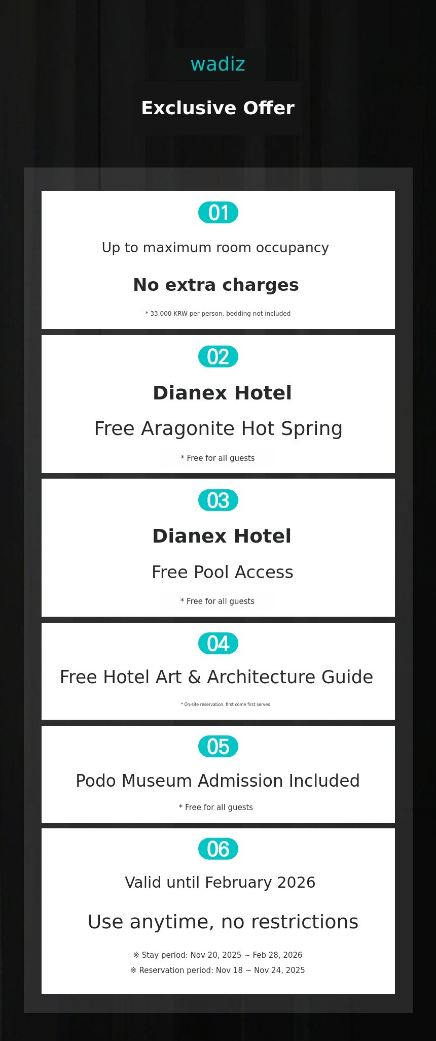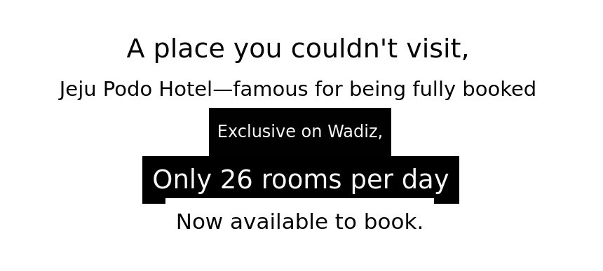 It has always been difficult to make a reservation and there are rarely any discounts at Podo Hotel, but now we are excited to introduce this great opportunity through Wadiz! The hotel is even more famous because it was designed by the world-renowned architect Dongryong Yoo (Itami Jun). From the staff's service to the room conditions and facilities, everything is highly satisfying. Purchase at the special Wadiz price!