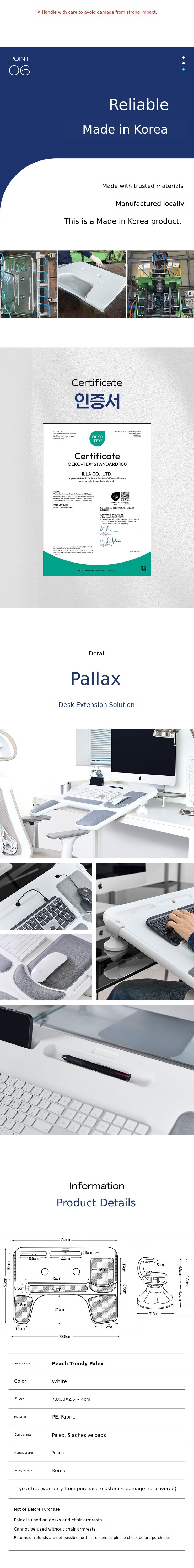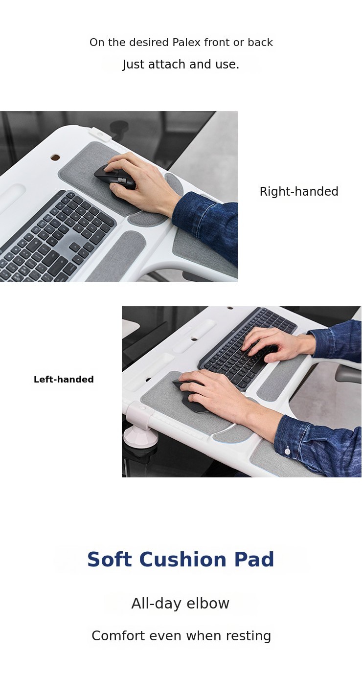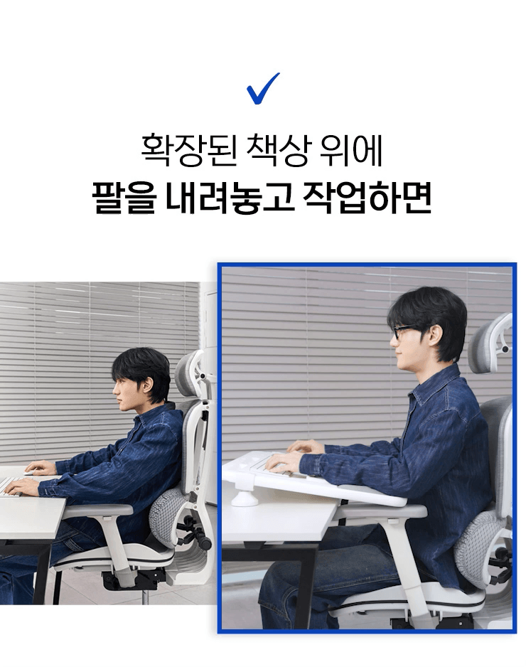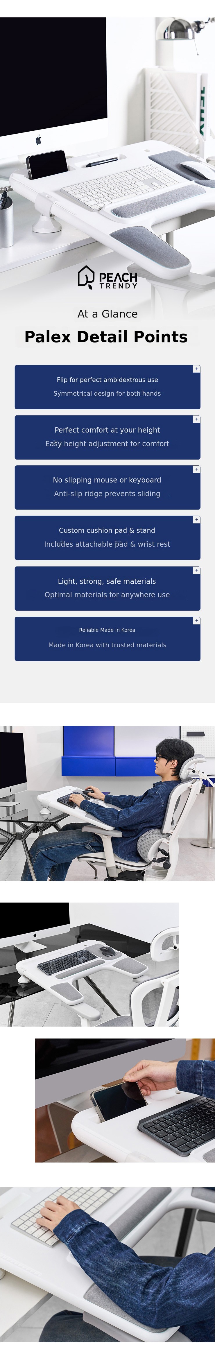Peach's Palex (Pal+Relax) is an innovative desk extension product that extends the desk up to the armrests of the chair, providing stable support for the elbows and maintaining comfort without musculoskeletal strain even during long hours of work.