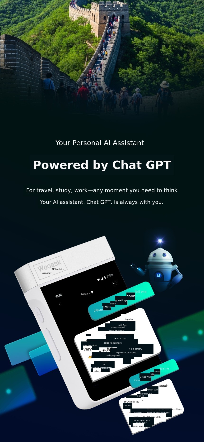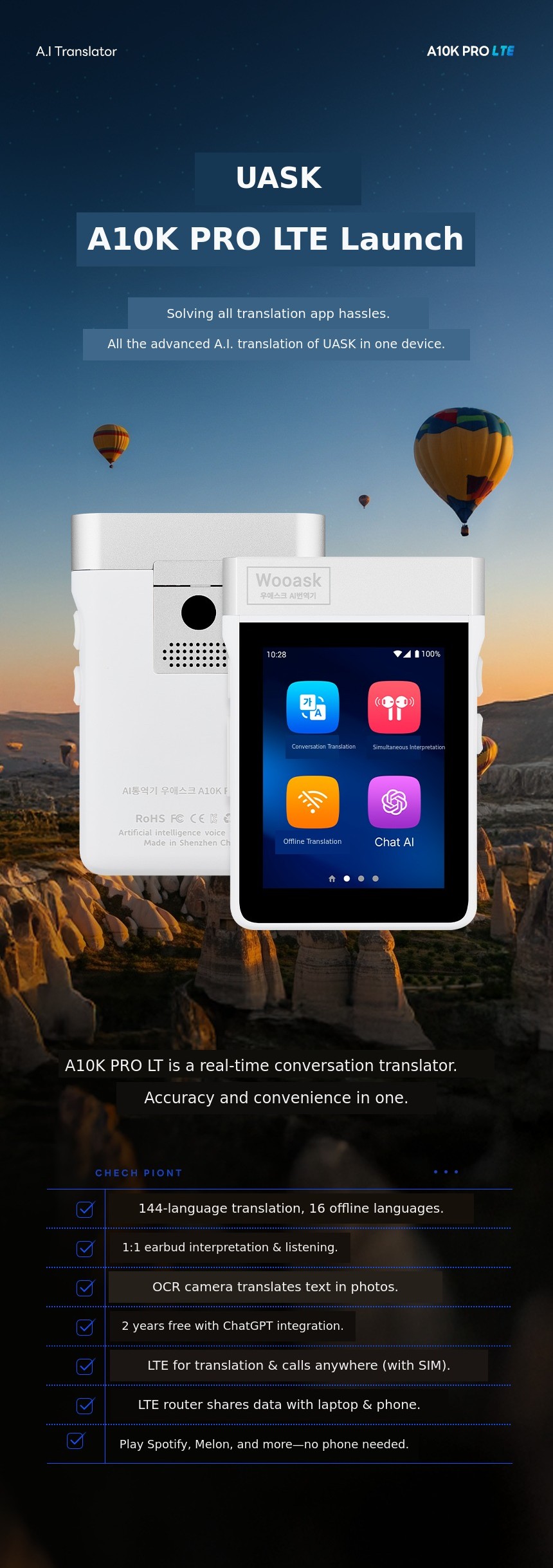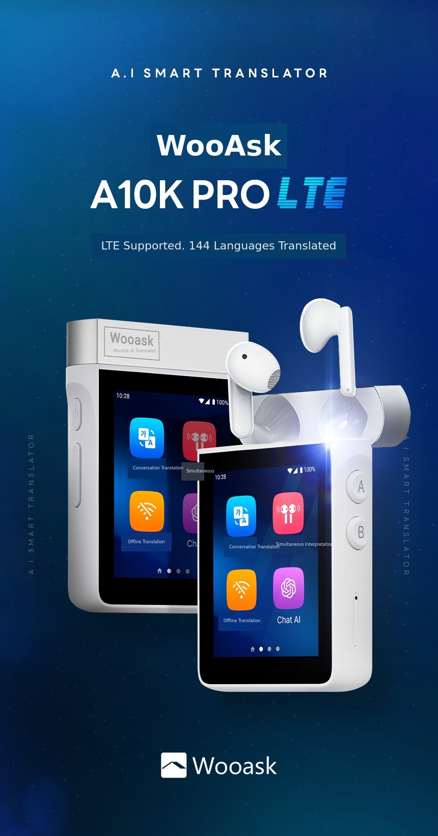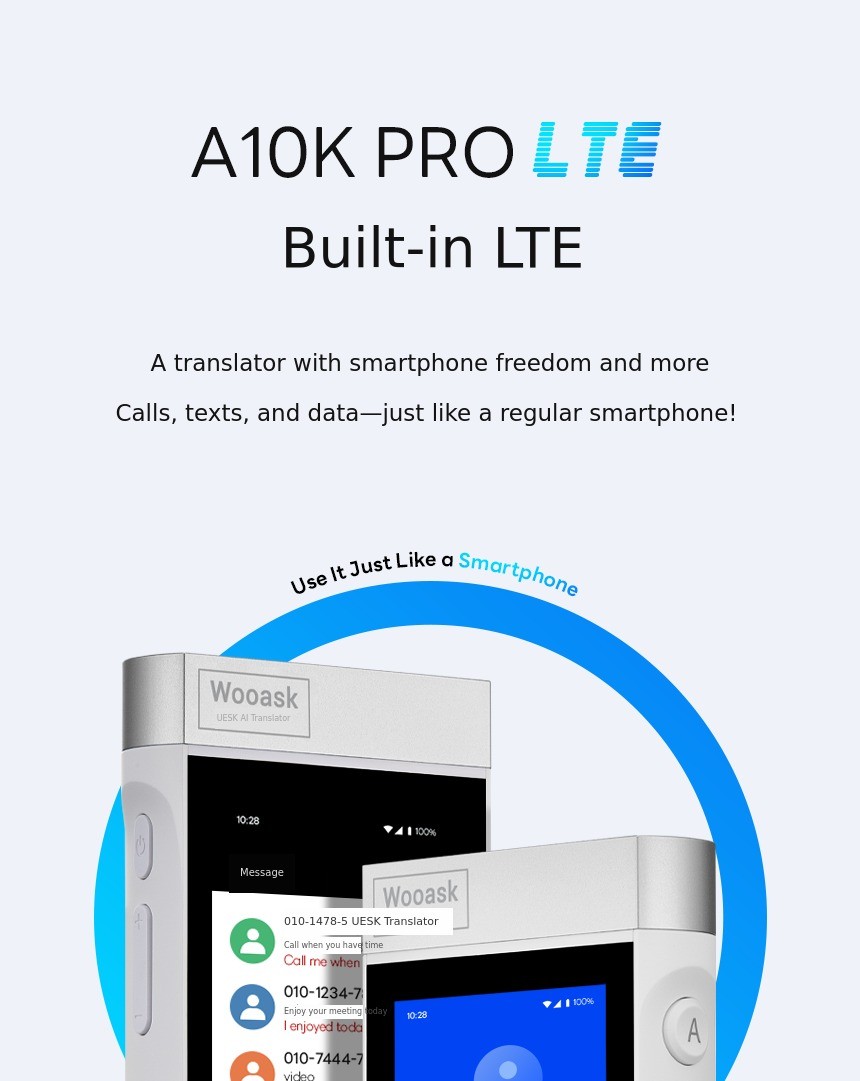 The next-level AI translator Woaisk A10K PRO LTE. Experience AI interpretation calls ChatGPT data sharing and music streaming—all in one device anywhere in the world. Comes preloaded with 16 languages perfect even without internet connection.