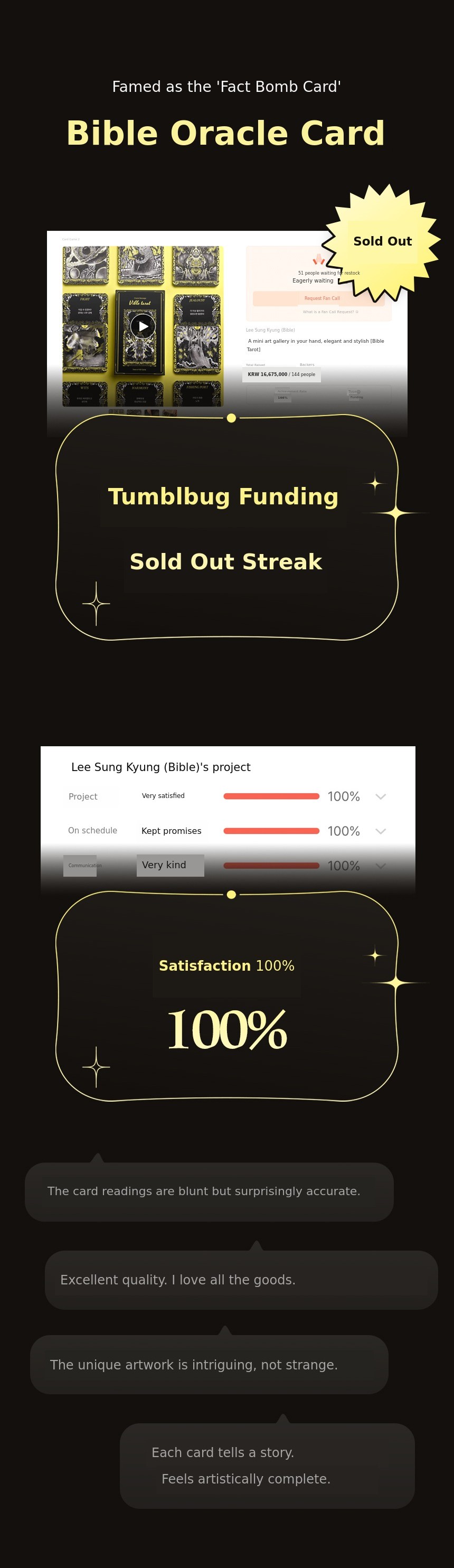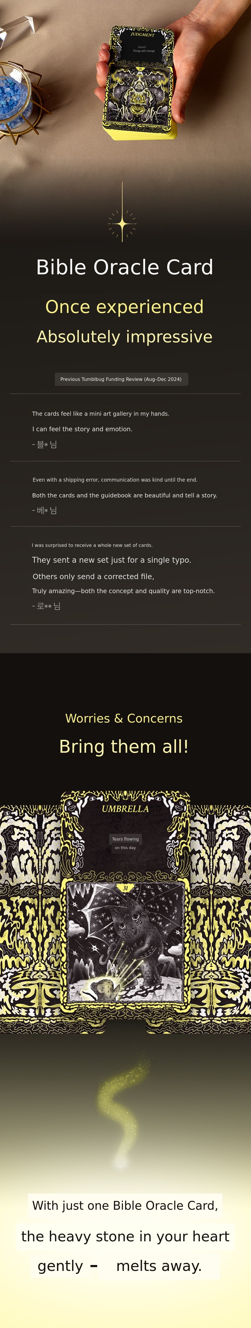 This Wadiz funding is the first journey to officially productize my research and records so far. Through this project, I aim to advance as a new emotional art brand that connects design, art, and spirituality. For some, Vible Oracle may be just a card, but for me, it is a survival story and a record of resurrection. I hope that in your difficult moments, a single card that says, 'It's okay, you're still alive,' will give you strength.