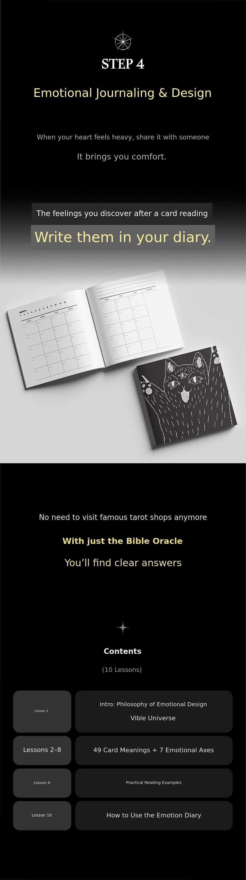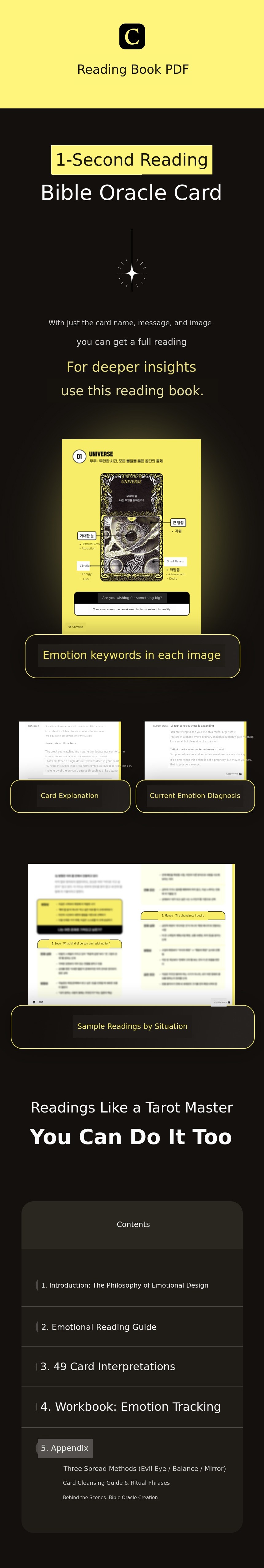 A. 'Vible Oracle Tarot' is designed so that even beginners can easily try emotional readings. The reading book PDF and online lecture (VOD) provide step-by-step interpretations and reading sentences for each of the 49 cards.
