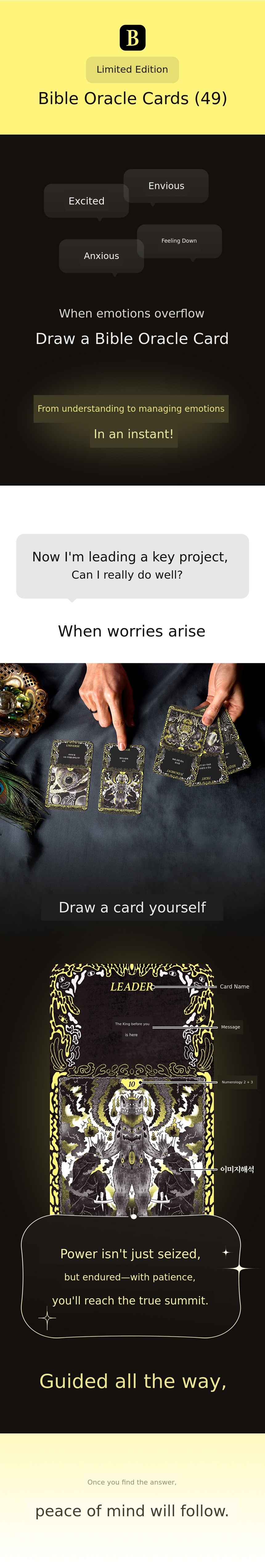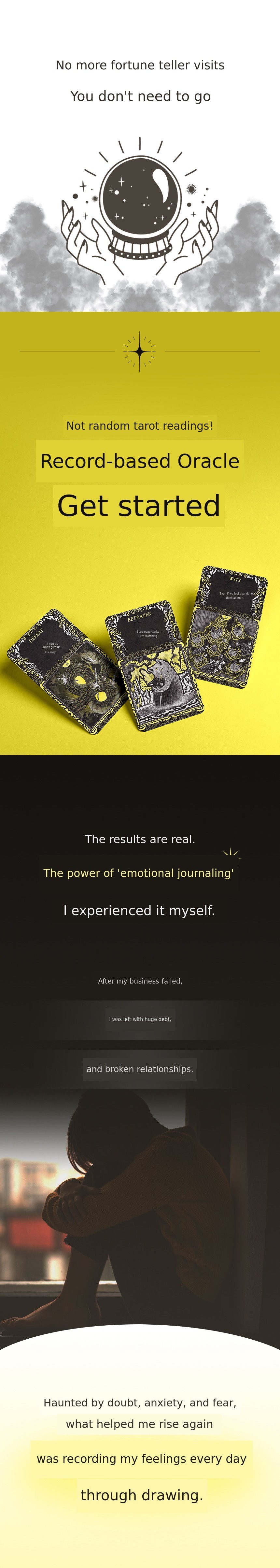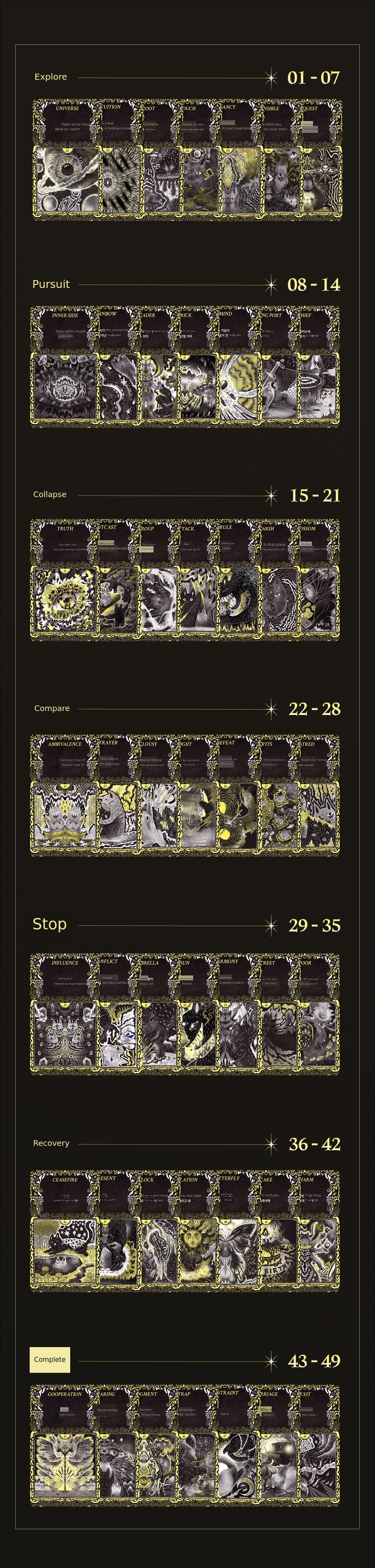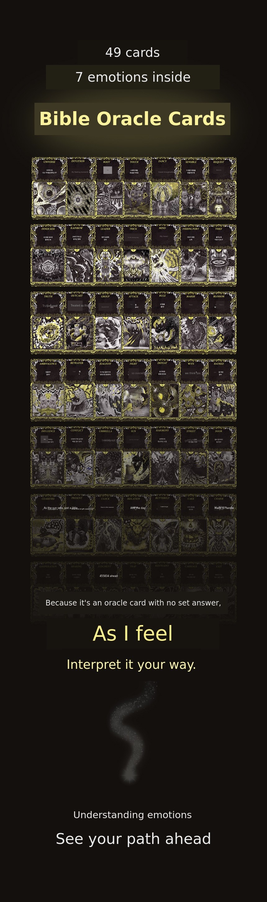 Vible Oracle Tarot is not just an ordinary tarot card. This card was created during the most difficult period of my life. When my business collapsed and I wanted to give up everything, I stayed in my room for over a month, insisting on living in darkness on my bed. The only thing I did on my bed was to record 'what emotion did I feel today' through drawings every day. Those records became the 49 oracle cards.