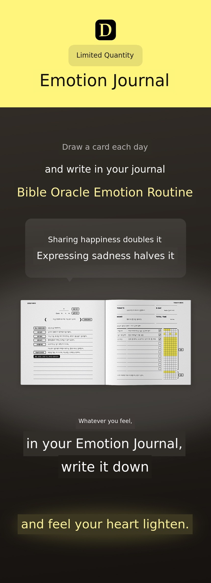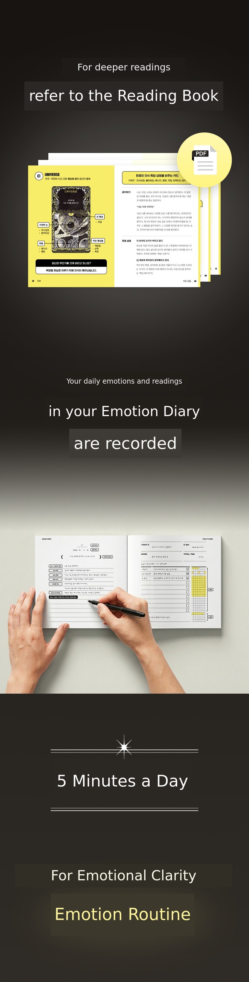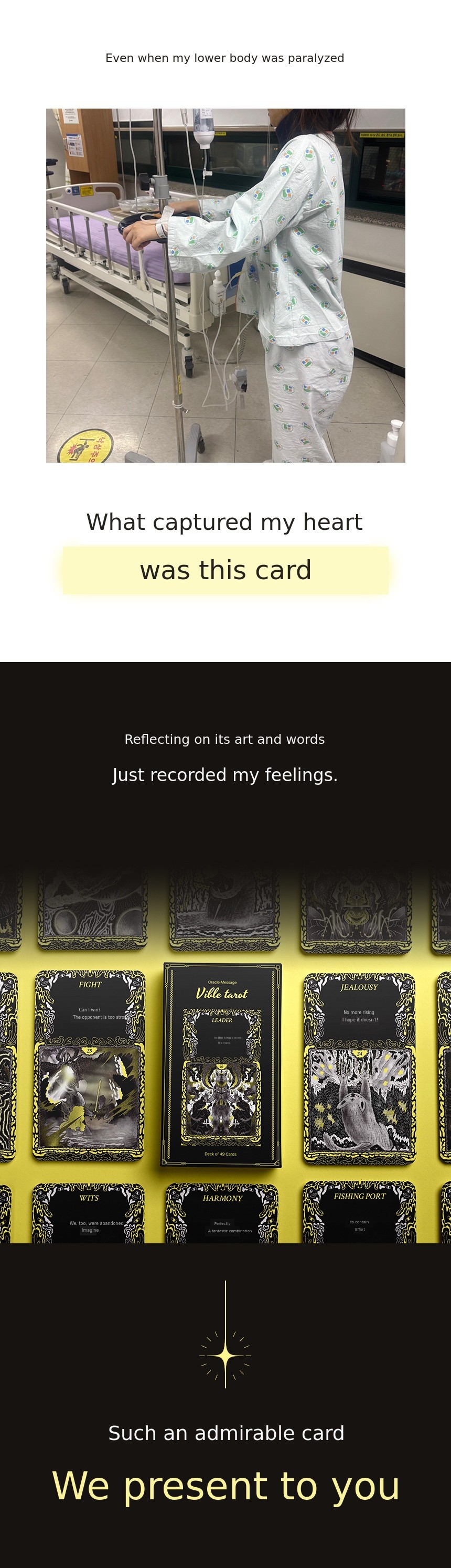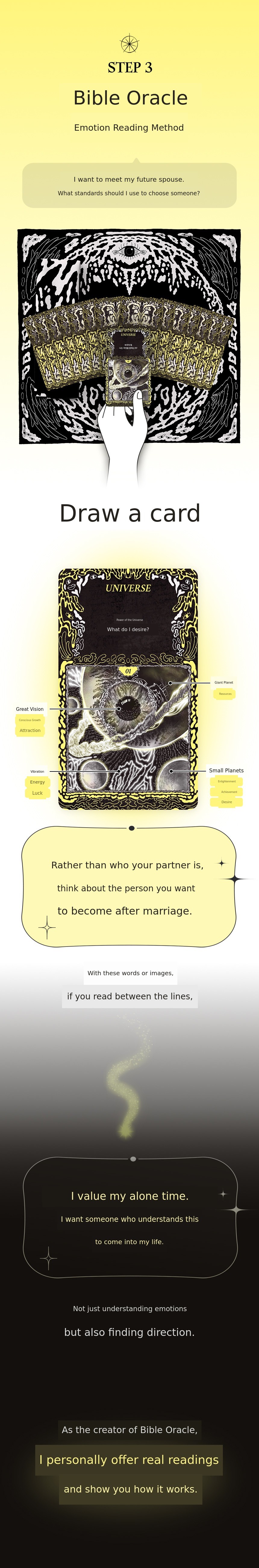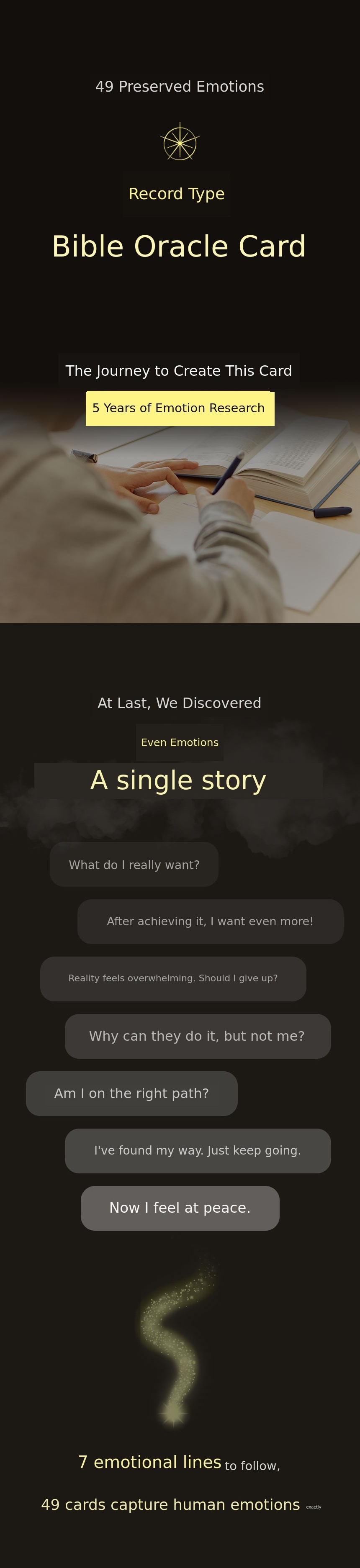Vible Oracle Tarot is not just an ordinary tarot card. This card was created during the most difficult period of my life. When my business collapsed and I wanted to give up everything, I stayed in my room for over a month, insisting on living in darkness on my bed. The only thing I did on my bed was to record 'what emotion did I feel today' through drawings every day. Those records became the 49 oracle cards.