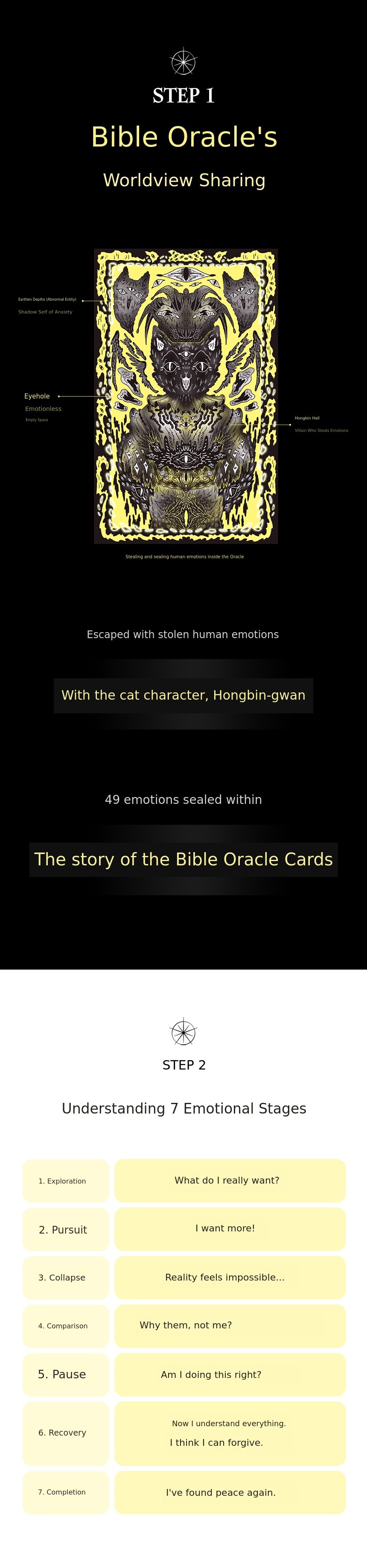 As a UX designer, I have studied 'designs that reduce anxiety and create reassurance' by observing users' emotions and behaviors. I analyzed how people's minds 'waver and recover' like data and captured the results in the 49 oracle cards. Vible Oracle, which encompasses 'emotion, design, and spirituality,' is an emotional design guide for people to recover their emotions on their own. The goal was to create an emotional map of life that moves from 'anxiety, anger, isolation, jealousy, and traps' to 'recovery, reassurance, light, and the sun.'
