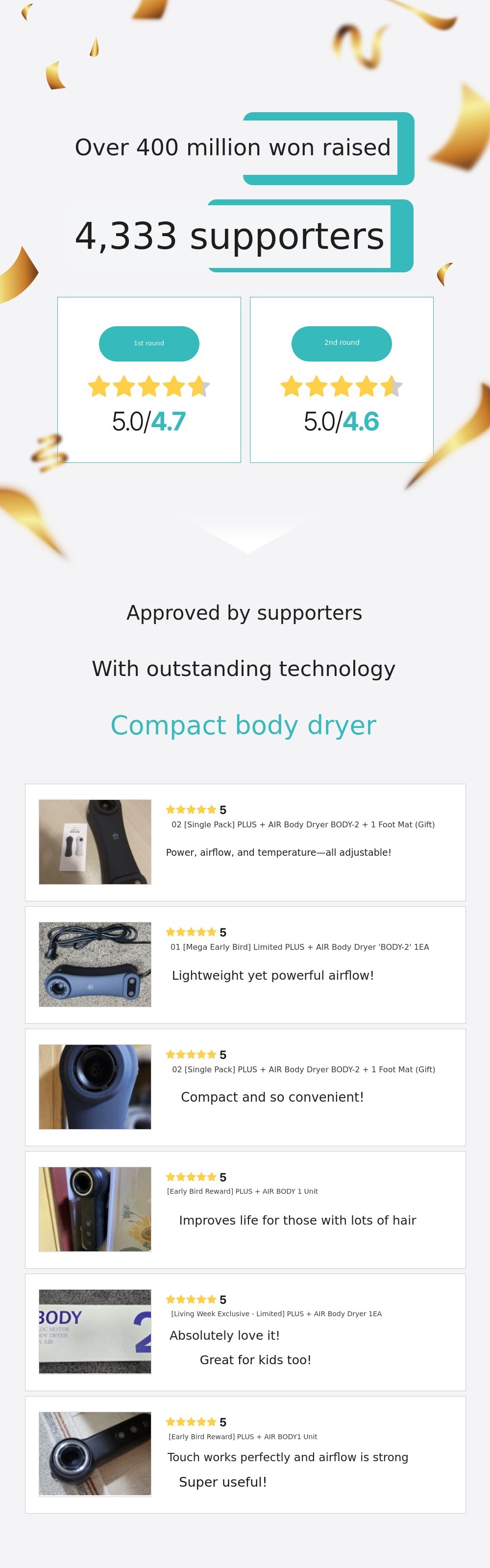 Our main product is a hair dryer, which is loved by many thanks to its ion technology and the latest features. Based on the successful launch of BODY-2, we are pioneering the ultra-compact body dryer market, and we aim to provide an even more convenient user experience with our innovative design and powerful performance.