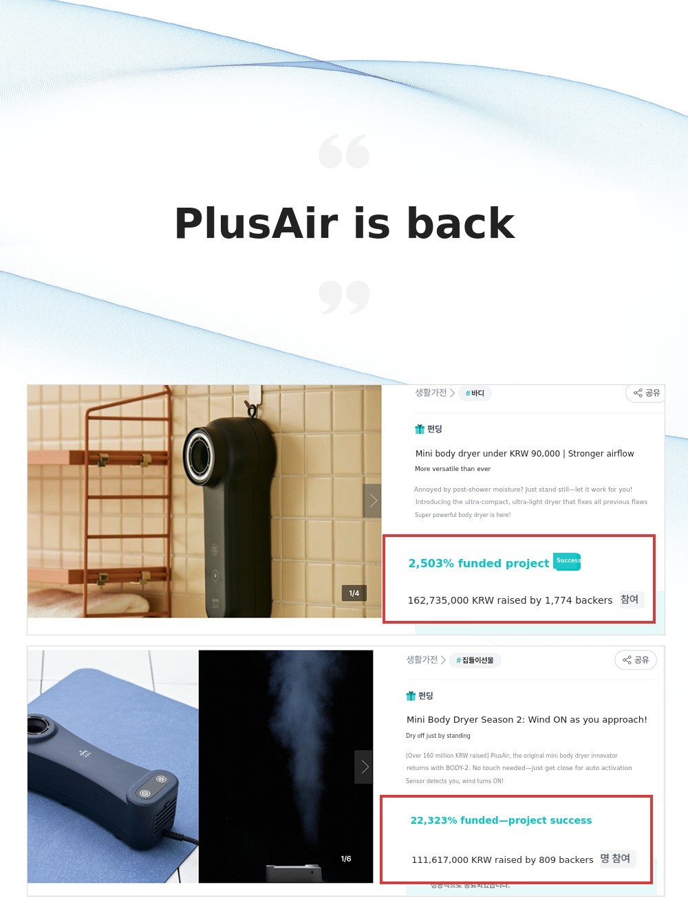By improving the shortcomings experienced when using body dryers in daily life and applying innovative technology, we have reborn 'Air Basic' and are challenging Wadiz funding again to promote it, improve quality of life, and propose a new lifestyle.