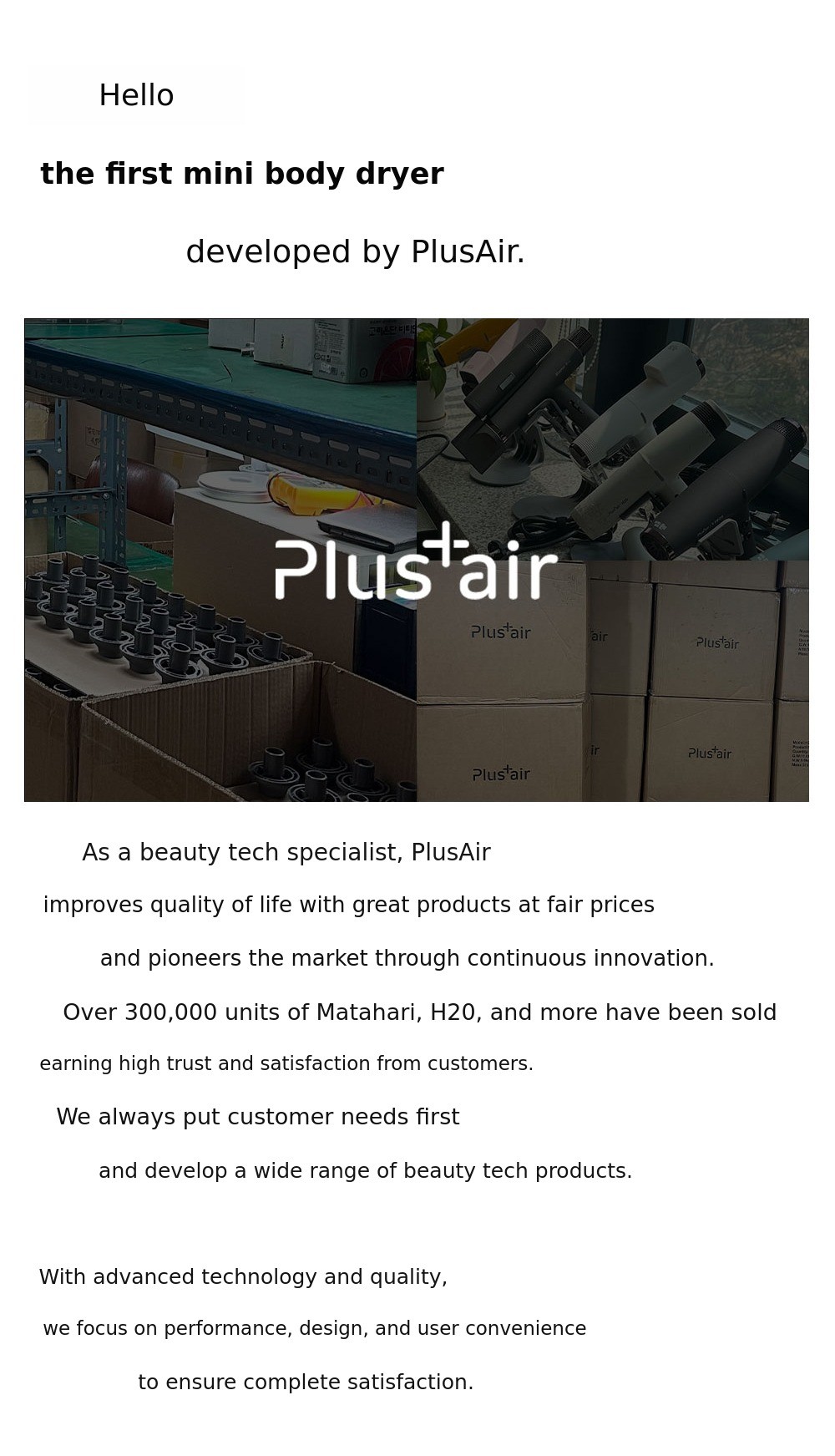Thank you sincerely for your love for our PLUS+AIR BODY-2. We are developing products that apply the latest technology to make people's lives more convenient and enriched. Our goal is to provide products that are accessible to a wide range of people at reasonable prices while maintaining high quality and performance.