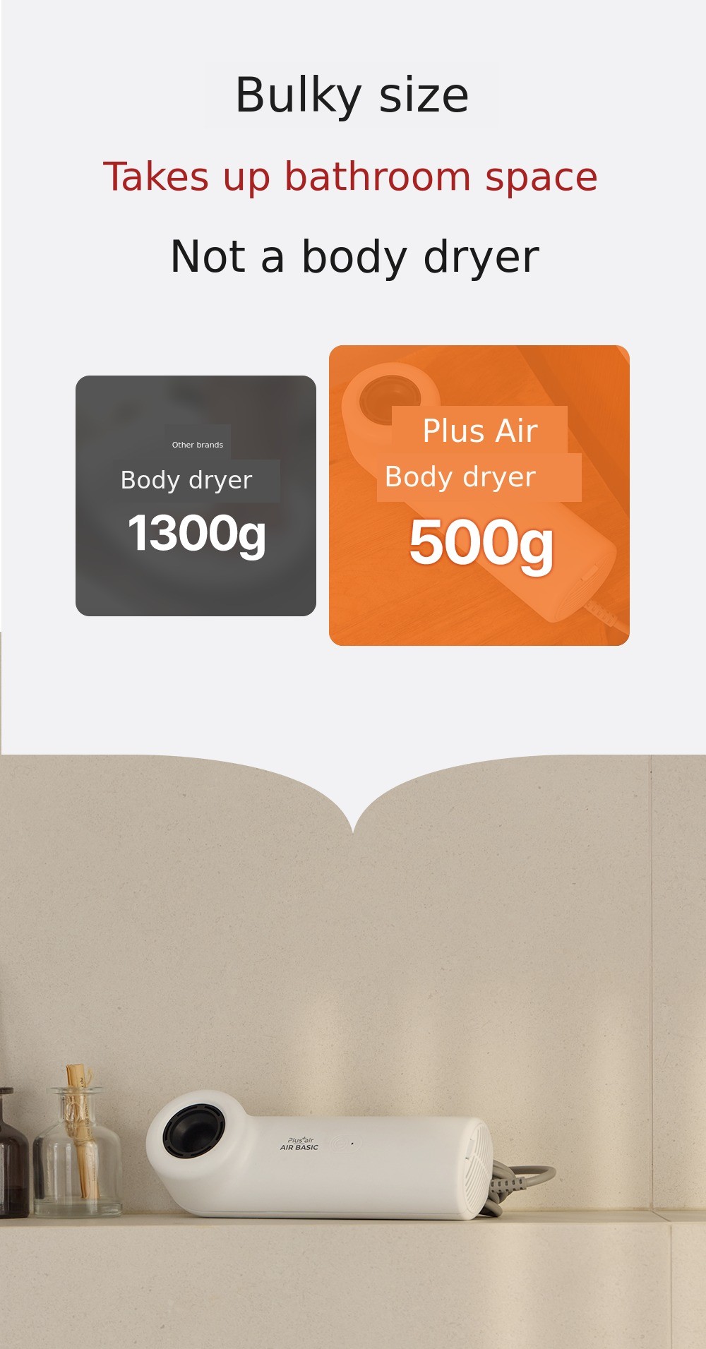While conventional body dryers lasted up to 3 minutes,The Basic model extends to 8 minutes, allowing you to fill the entire bathroom with warm air and raise the temperature.