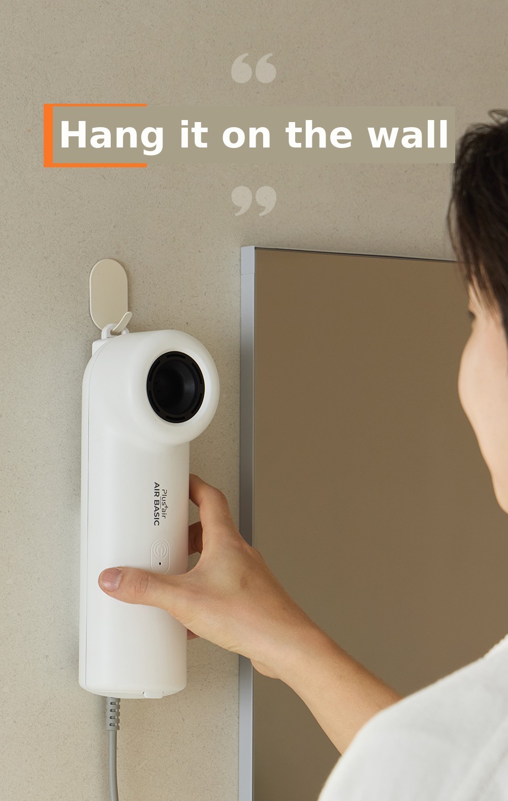 The product is equipped with a hook that allows it to be hung on the wall.If you hang a non-drilling hook on the wall and always hang the body dryer, it becomes even more convenient.