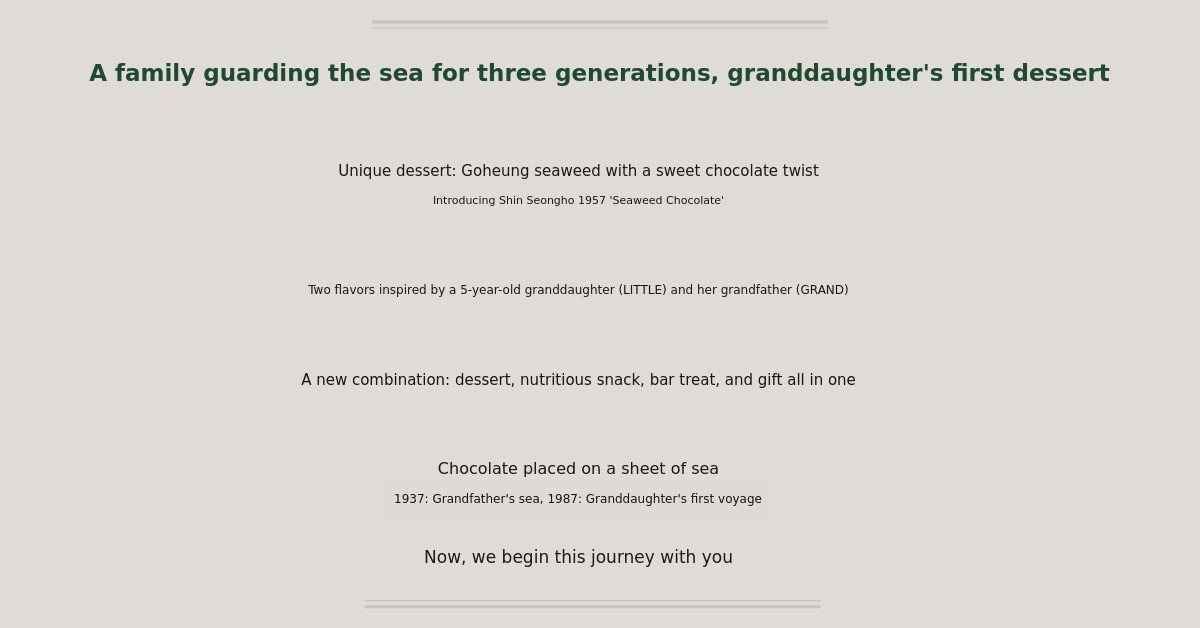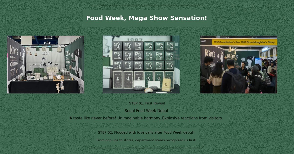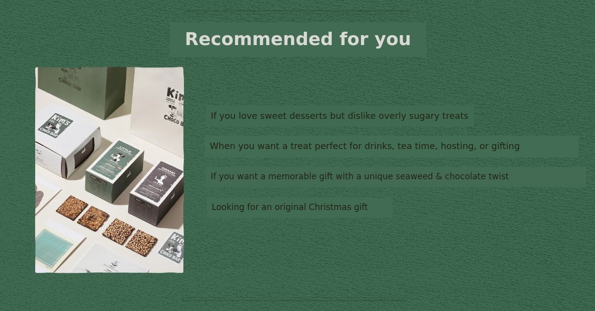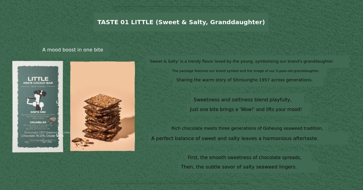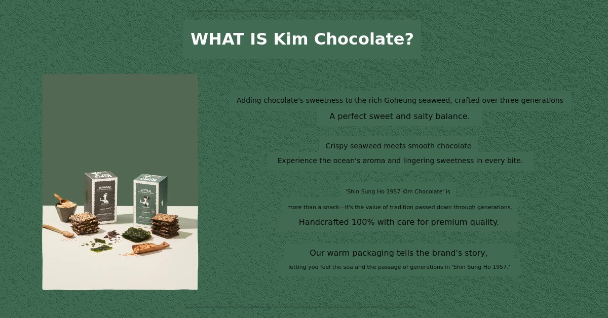 1. 🍫 Kim Chocolate Dessert - Unique flavor combining premium Goheung seaweed and chocolate 2. 👪 Three-Generation Story - Emotional connection inspired by granddaughter and grandfather 3. 🎁 Exclusive Gift Set - Includes seasonal seafood calendar and dual-purpose bookmarks