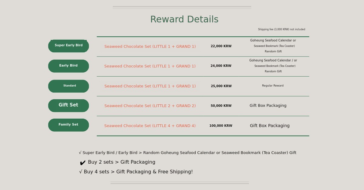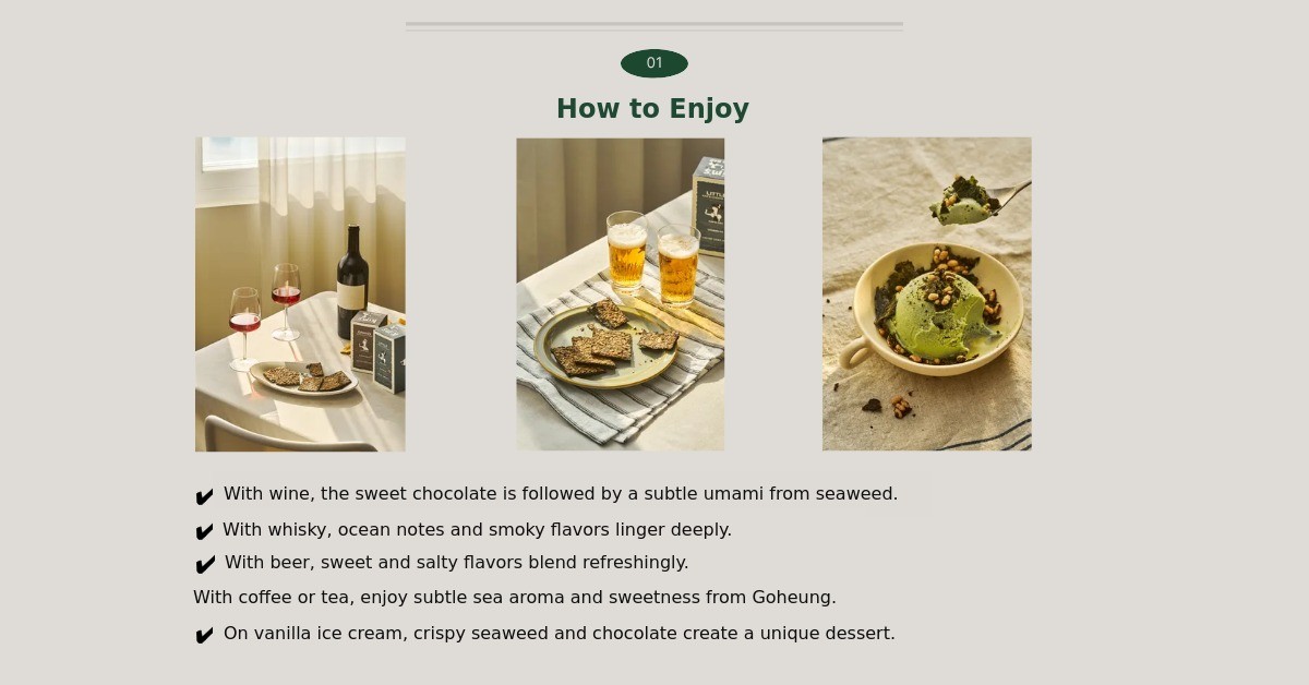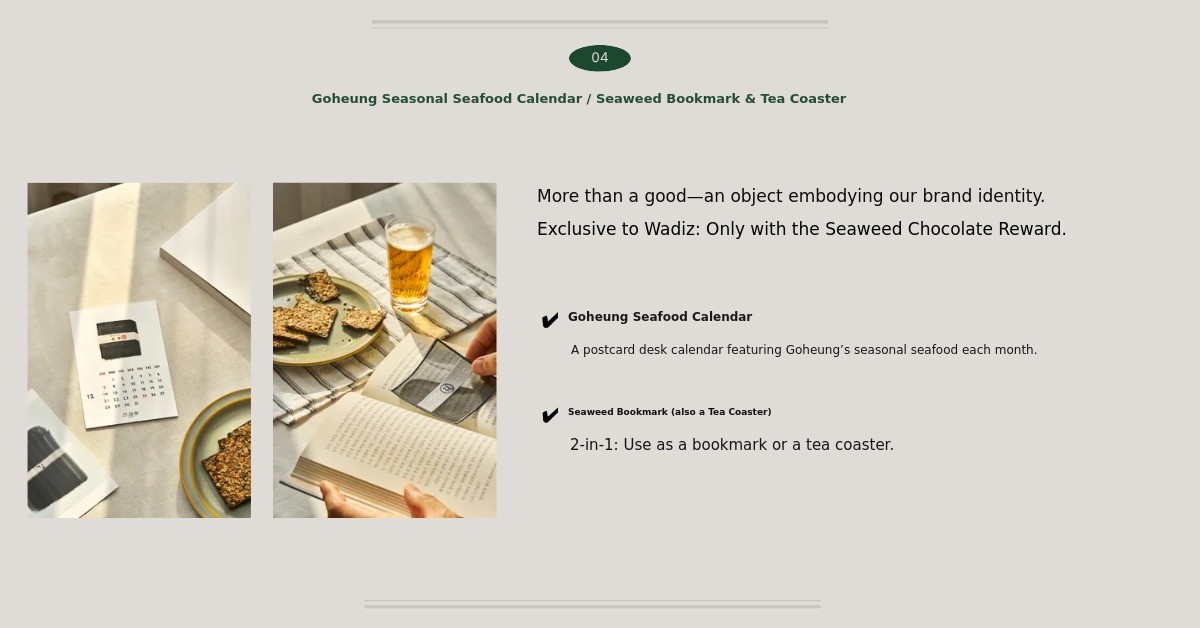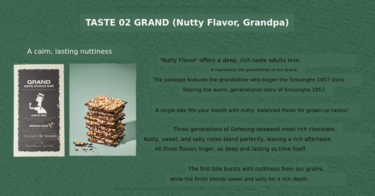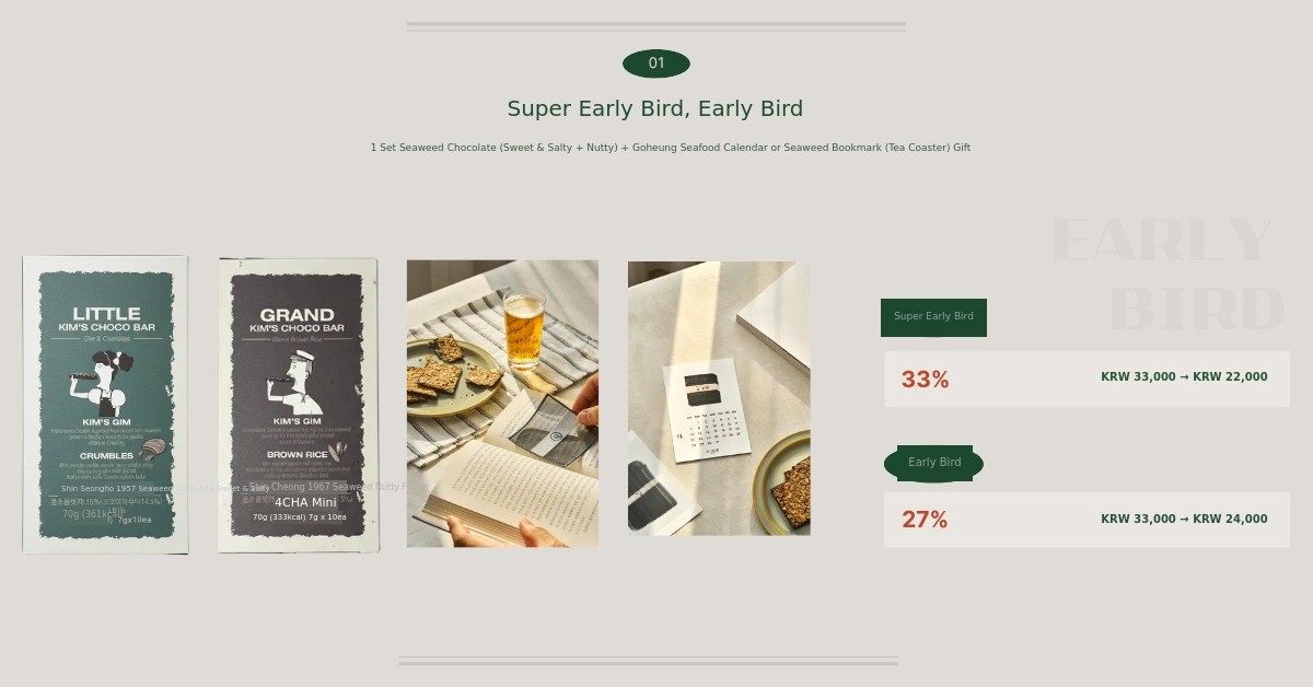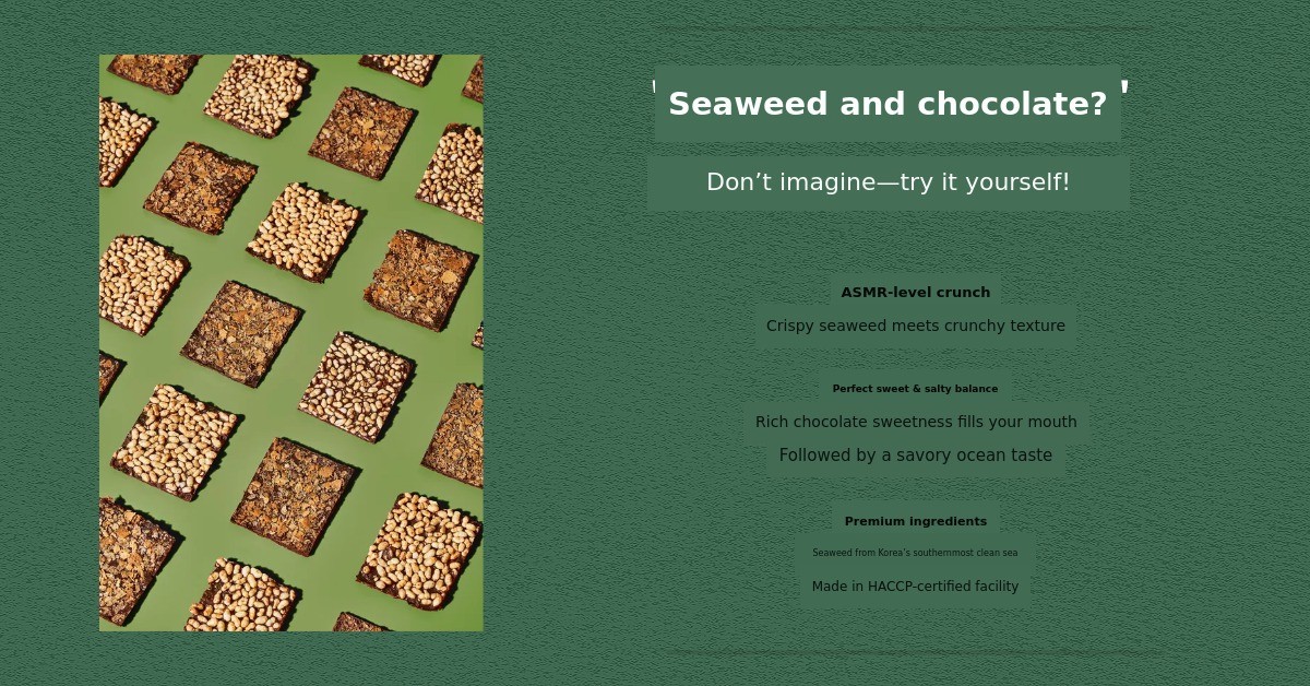 1. 🍫 Kim Chocolate Dessert - Unique flavor combining premium Goheung seaweed and chocolate 2. 👪 Three-Generation Story - Emotional connection inspired by granddaughter and grandfather 3. 🎁 Exclusive Gift Set - Includes seasonal seafood calendar and dual-purpose bookmarks