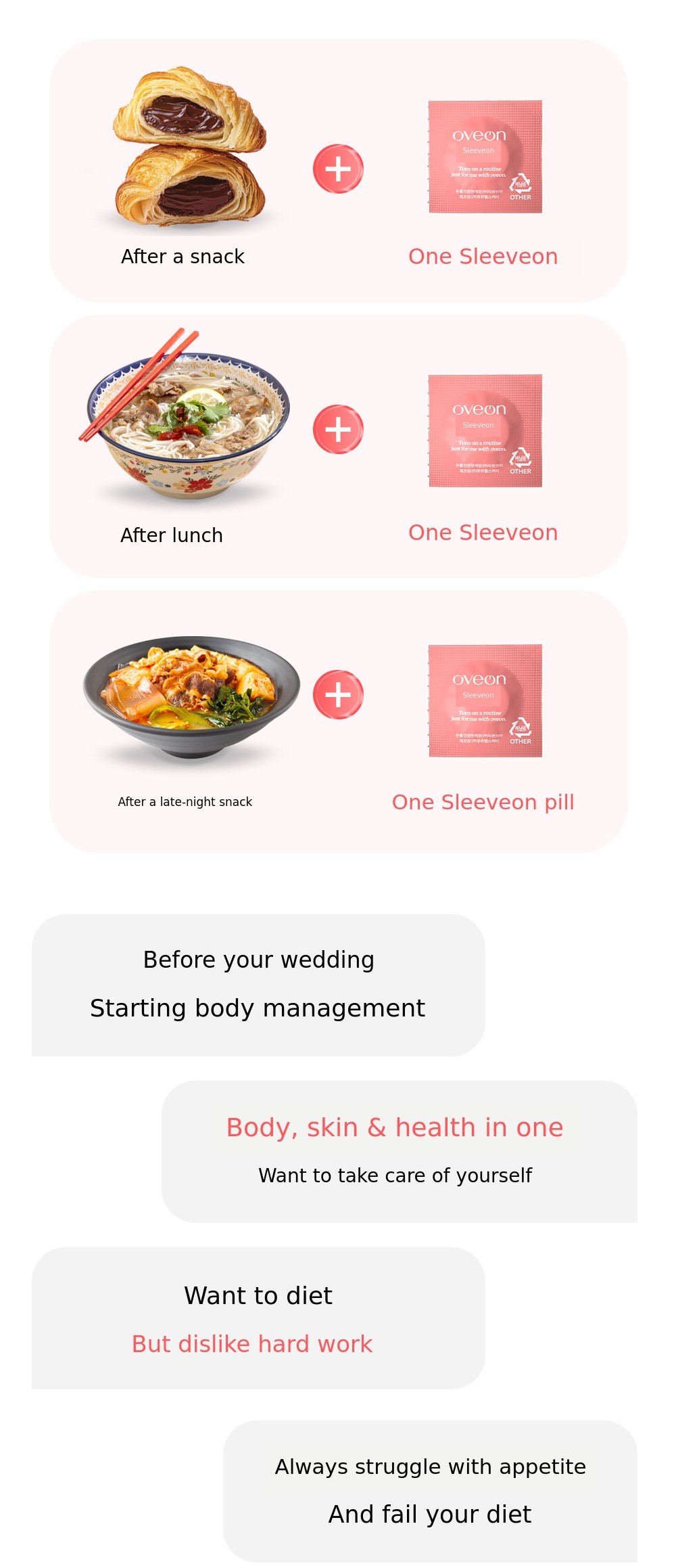 → Sleeveon goes beyond simple weight loss,considering body fat, appetite control, skin, and immunity, all at once,with an all-in-one slimming design, it is.