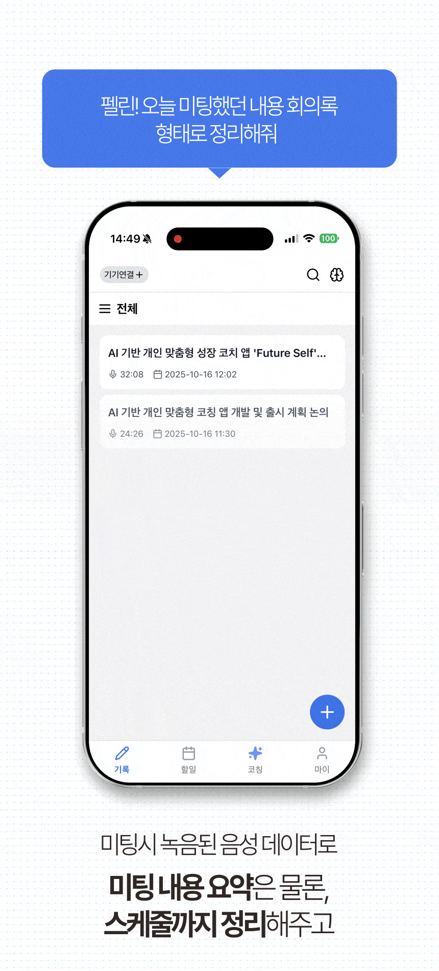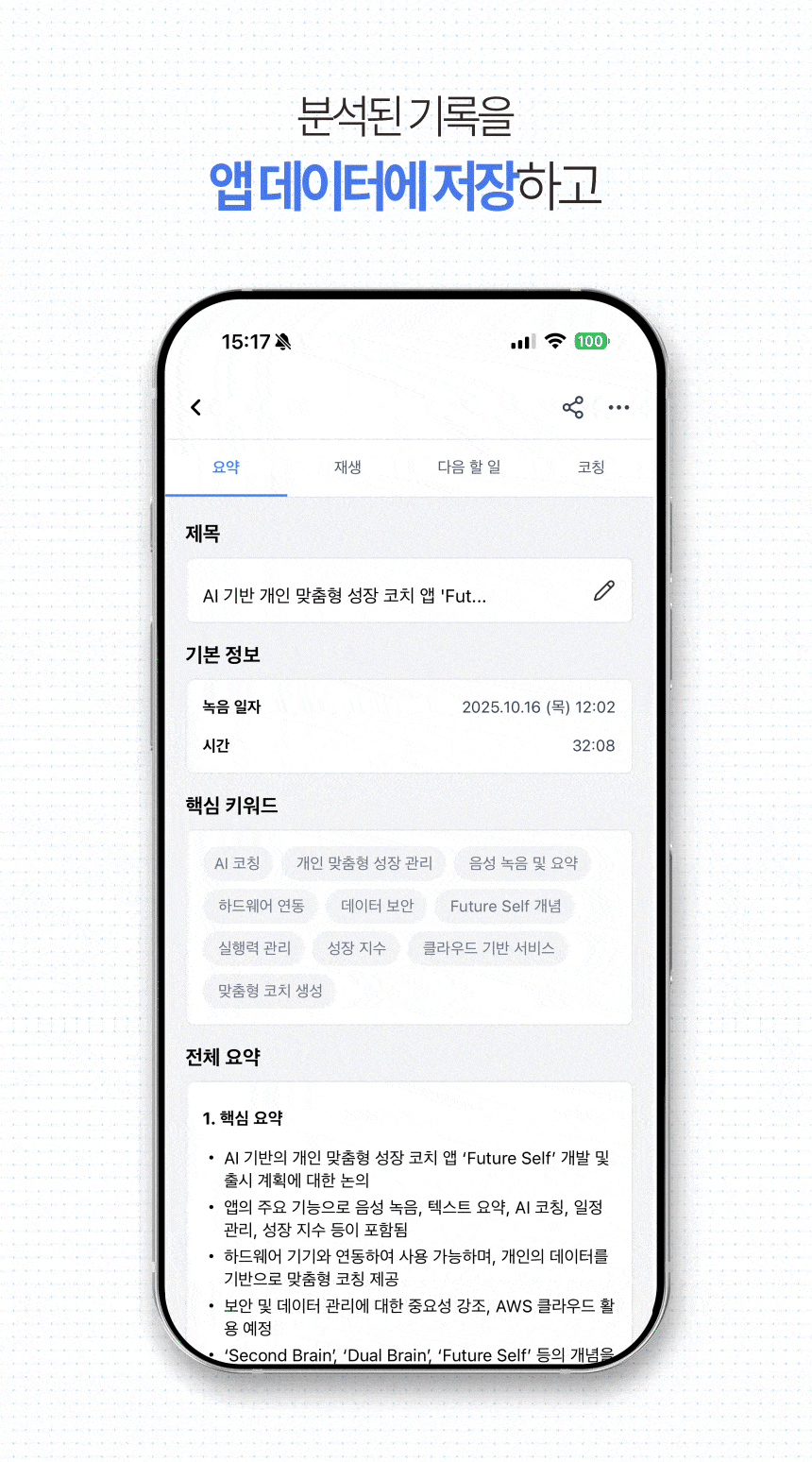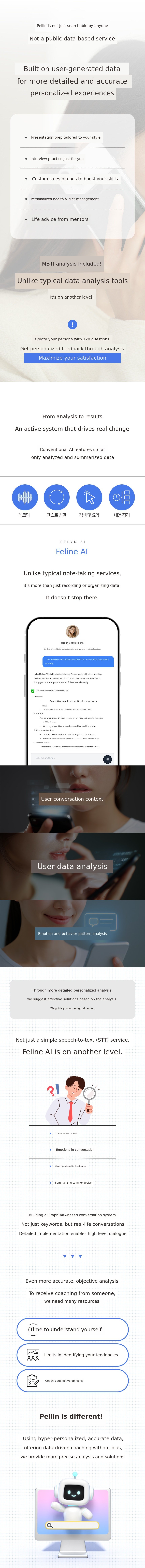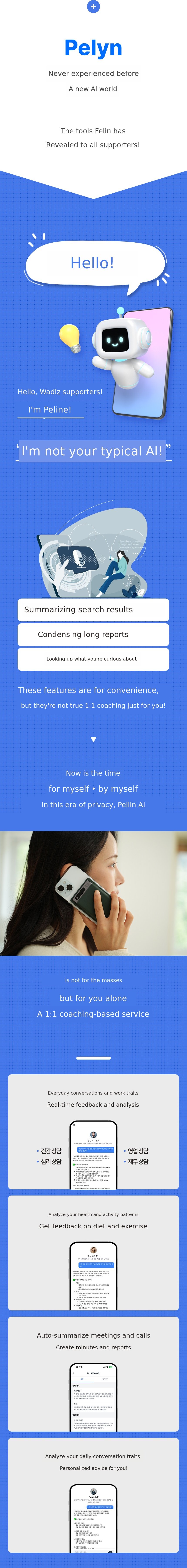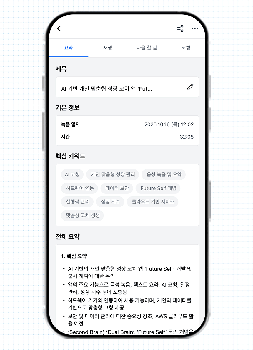 Pelyn AI, introduced through Wadiz, is the result of expanding Datamond's data analysis capabilities into personal growth coaching. Pelyn AI offers a second brain function that automatically transcribes and summarizes conversations recorded on dedicated devices and smartphones, and even generates to-do lists. It also proposes dual brain coaching by creating a personal persona to suggest customized questions and broaden perspectives.