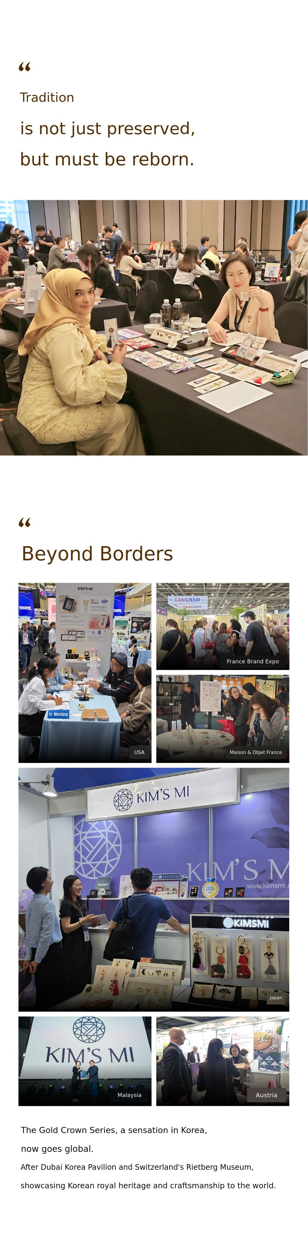 The Silla Gold Crown series has been recognized for its unique design and excellent quality, being selected for the National Museum of Korea's MU:DS. In addition, KIMSMI has solidified its expertise and value through various awards and certifications, including the K-Ribbon (Excellent Cultural Product), National Museum Foundation Award, Outstanding Enterprise Commendation, Seoul Award, selection as SEOUL MY SOUL goods, and a gold medal at the Women's Invention Contest.