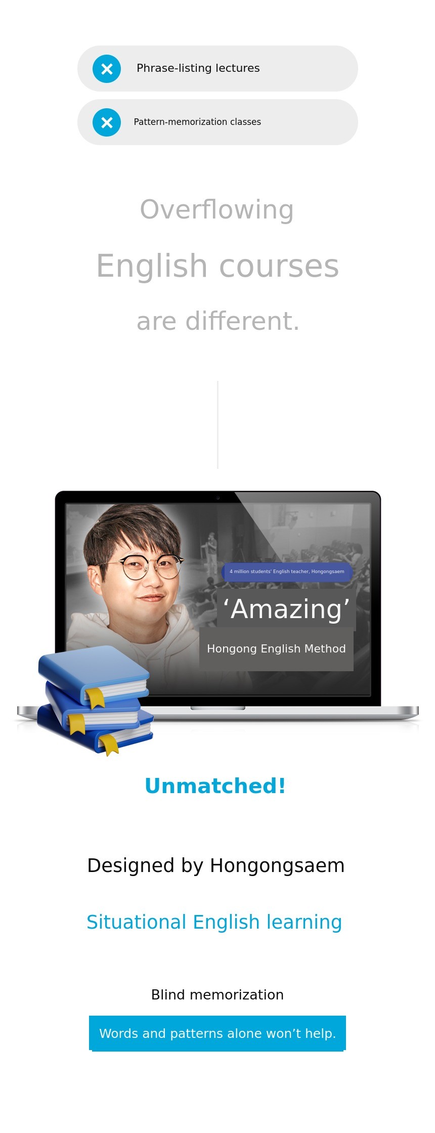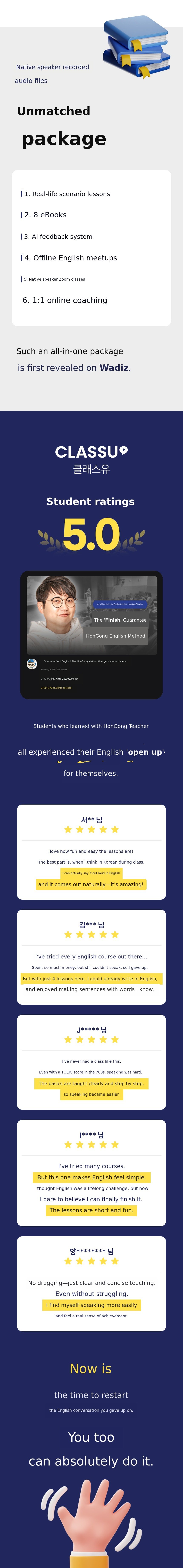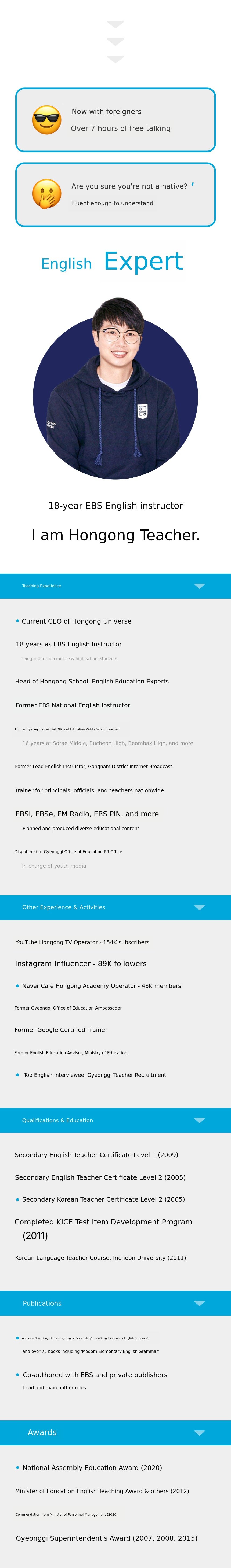 Everyone, the number one language that can bring great change to your life is English. If smart Koreans add English skills, they can do anything. Because I know so well the hardships of being a beginner, I was able to become an English instructor who truly understands your perspective. I will do my best, with the most efficient methods, to help you study English on your own and improve your skills.