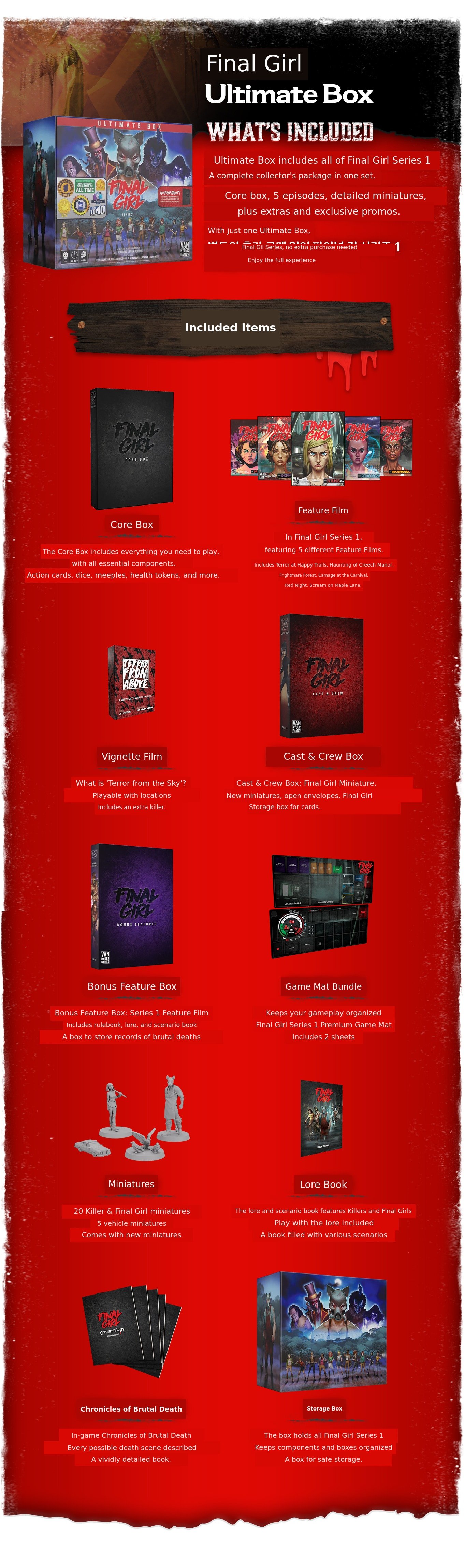 Final Girl Series 1 includes a Core Box, individual Feature Films, play mat, miniature set, bonus Feature Box, lore and records of brutal deaths, and various other components.