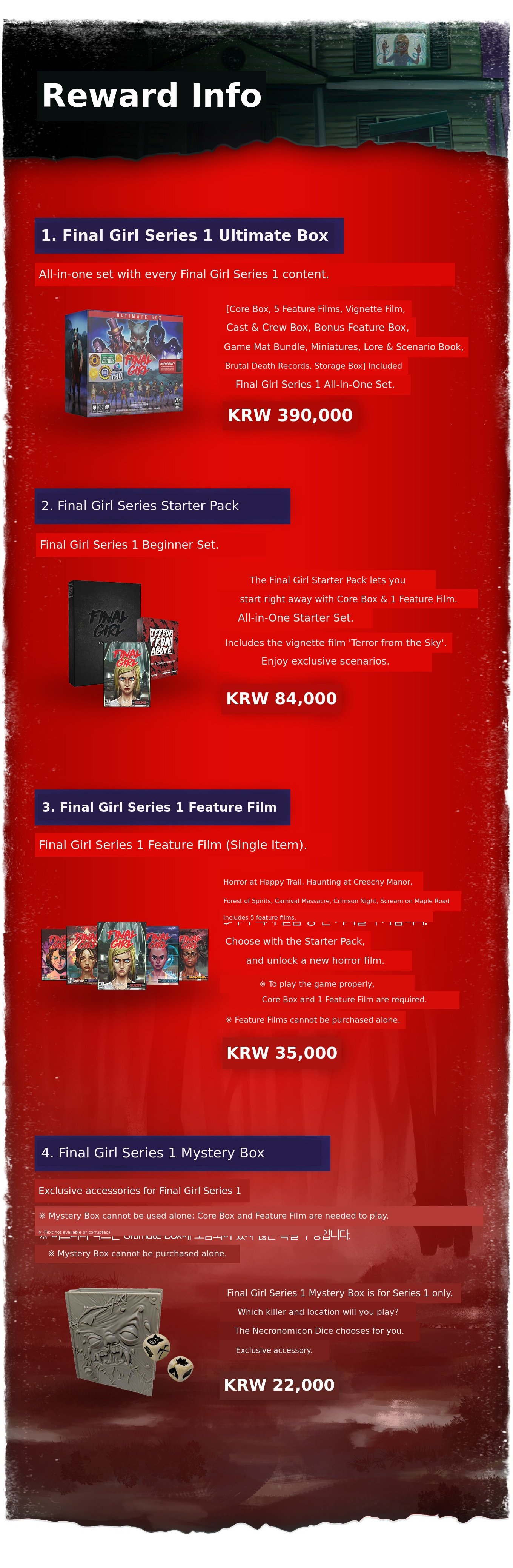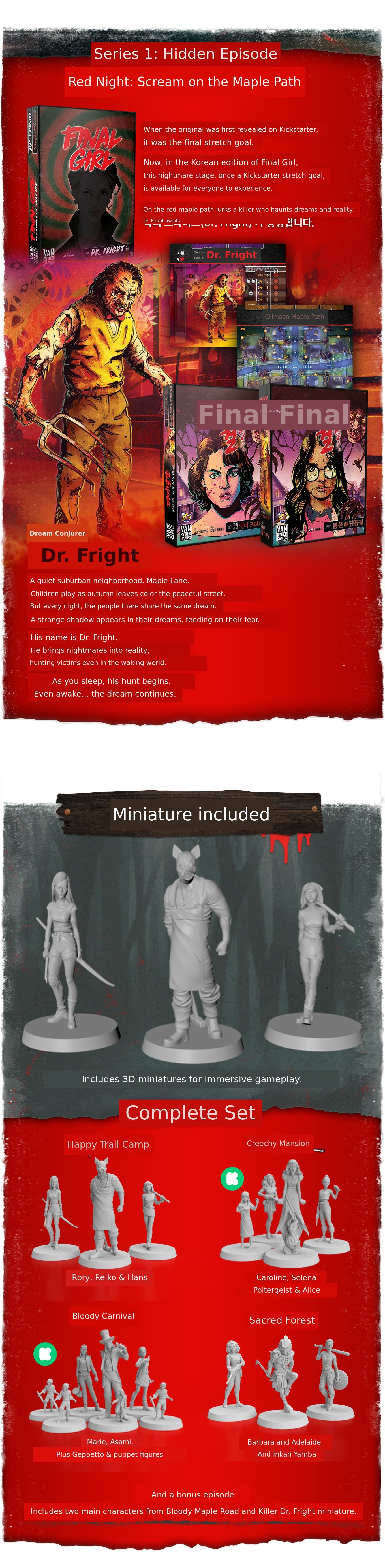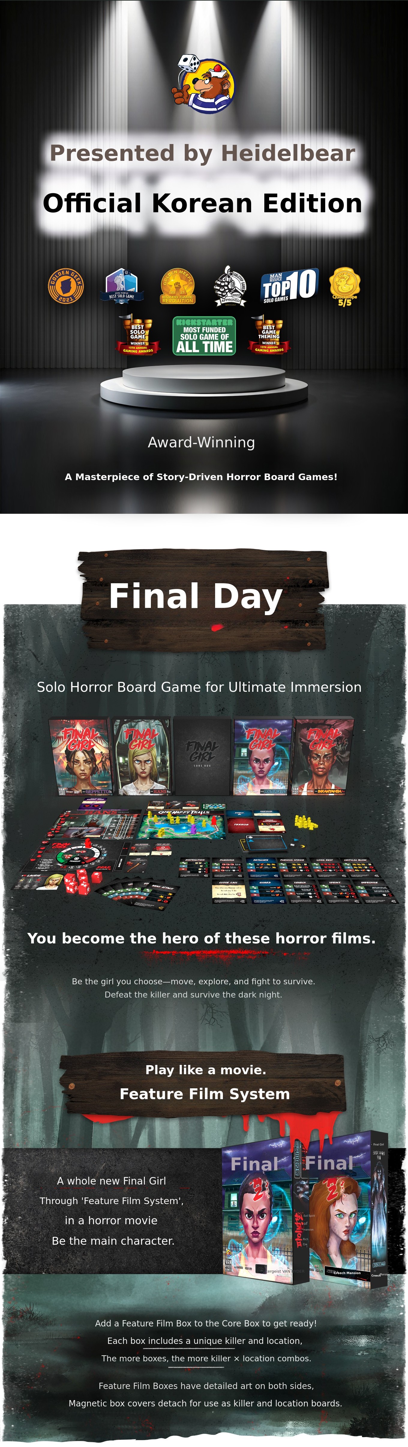 This is the beginning of properly introducing the official Korean edition of Final Girl to domestic board gamers and newcomers. We chose Wadiz, the leading platform, to introduce the captivating storyline and gameplay of Final Girl to our supporters.