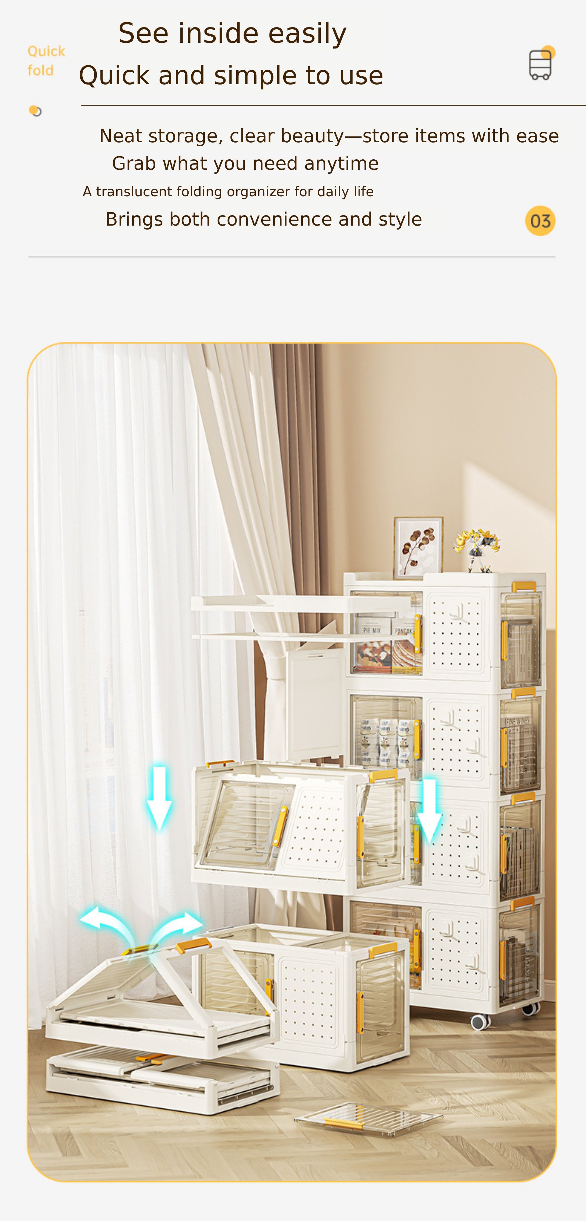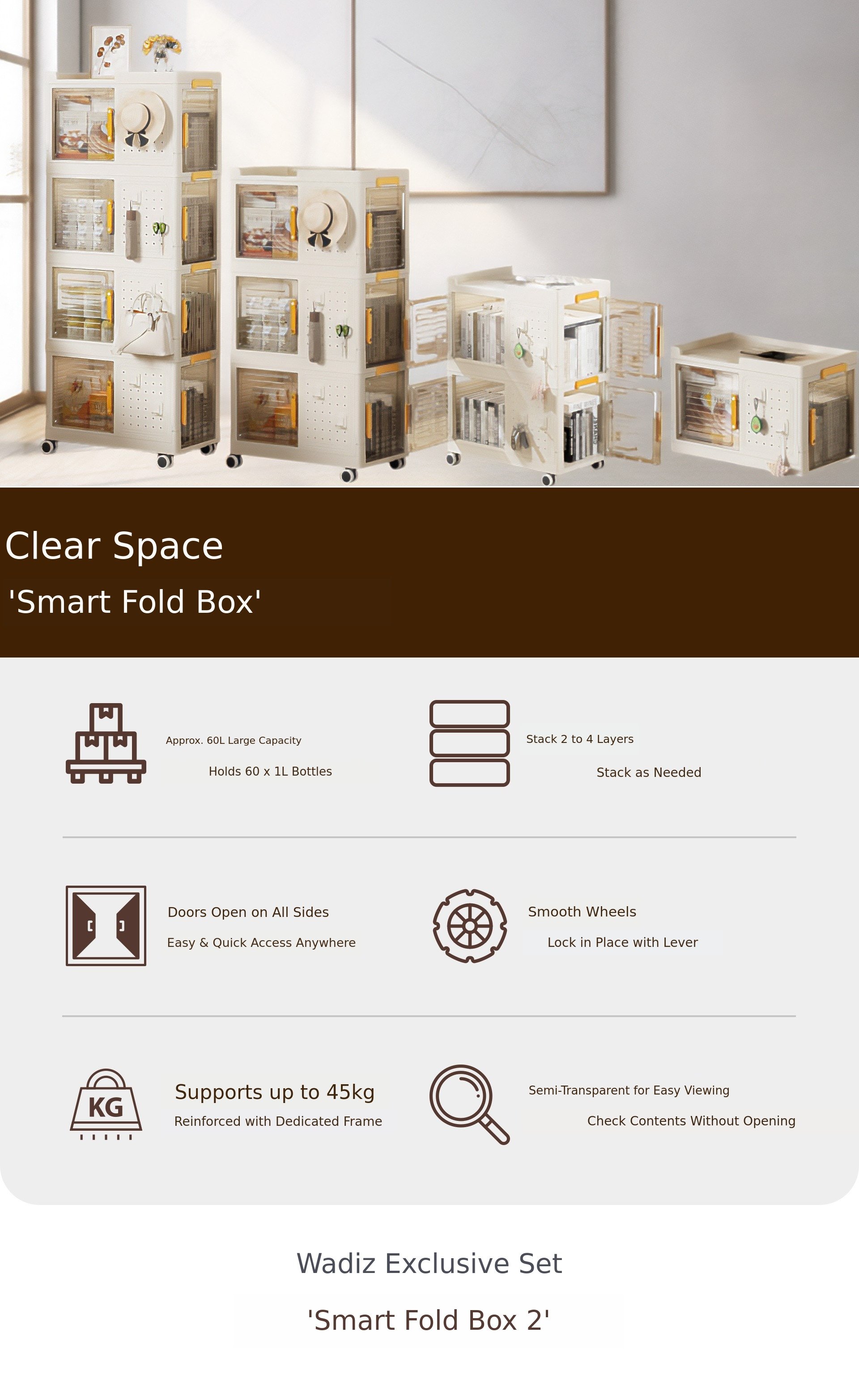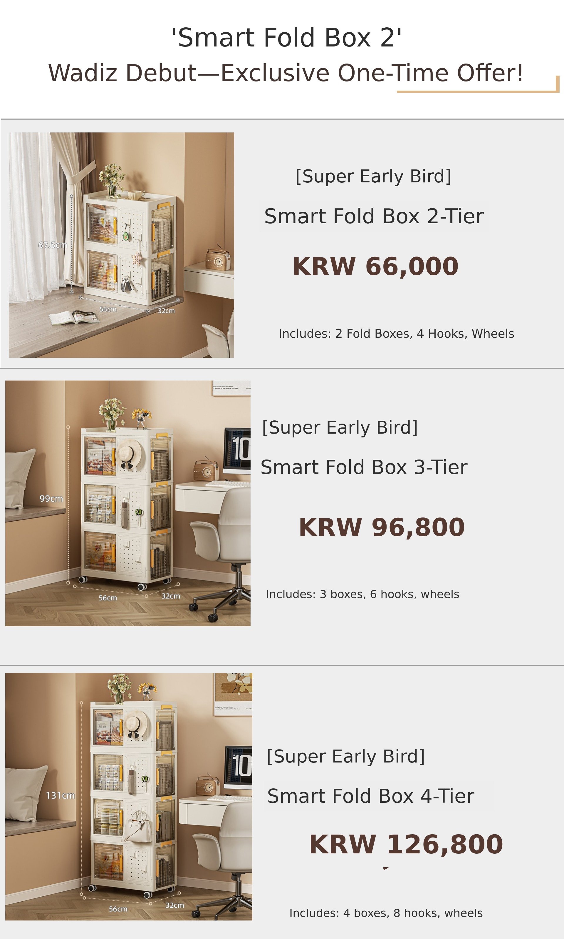 1. 📦 3-Tier Transparent Foldable Storage - Fold, stack, and slide for space-saving and neat organization 2. 🔍 Transparent Window for Easy Viewing - Semi-transparent doors allow quick access and content check 3. 🎁 Exclusive Limited Edition Set - Wadiz exclusive with multiple tiers and included accessories