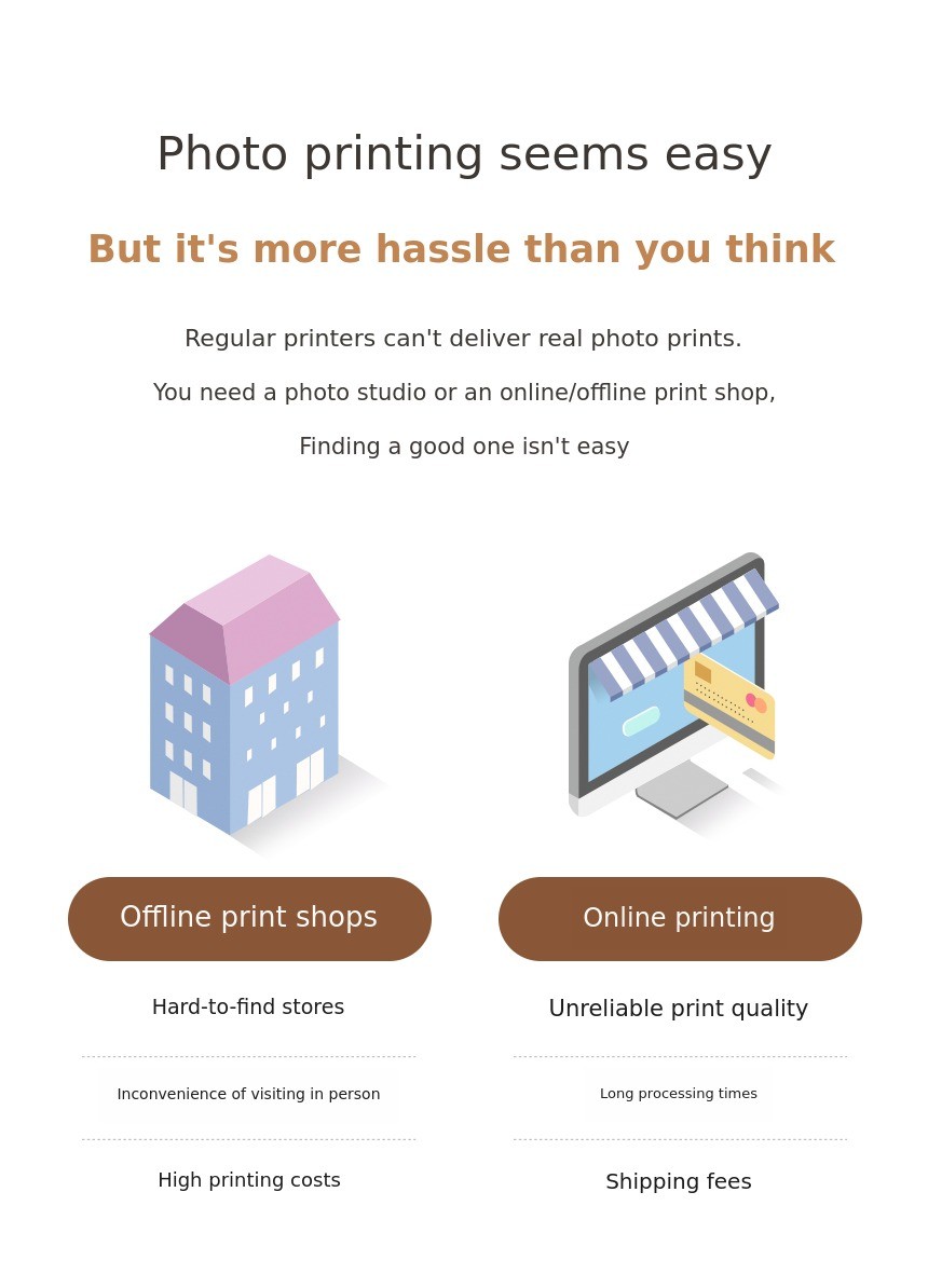 Moreover, photo labs or online printing services take time for delivery and have limitations in capturing your own emotional design.