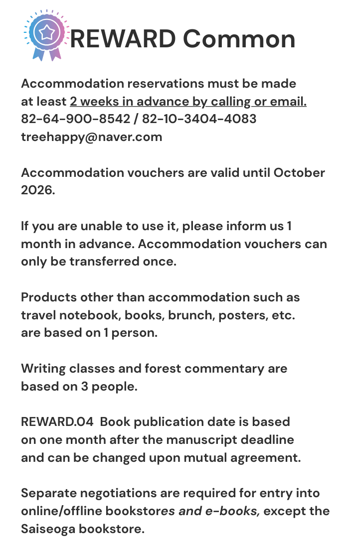 *REWARD.04: Paper books are printed in two colors, up to 200 pages, based on B6 or 4x6 format (128 x 182 mm). Prices will be negotiated separately if printing specifications change.
