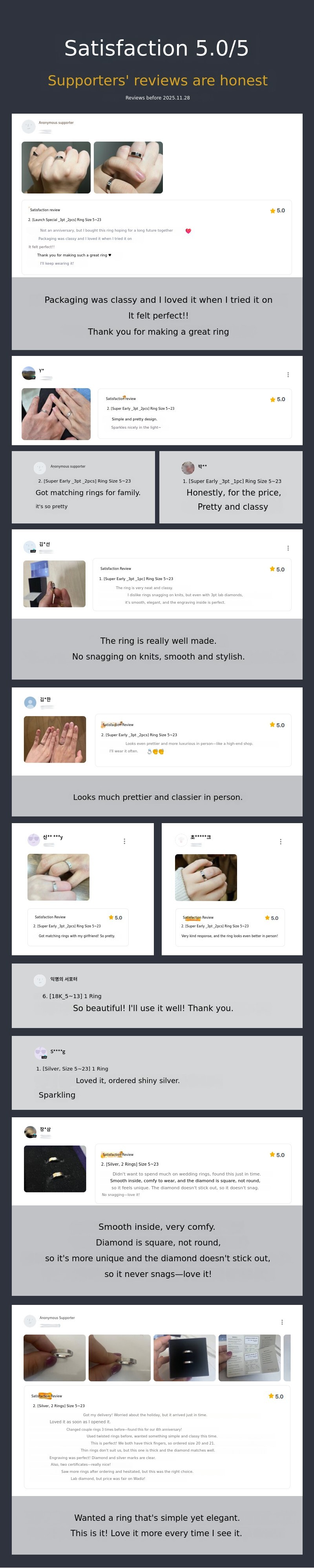 1) We produce only with silver/14K/18K gold that meets standard specifications and the specified diamonds.