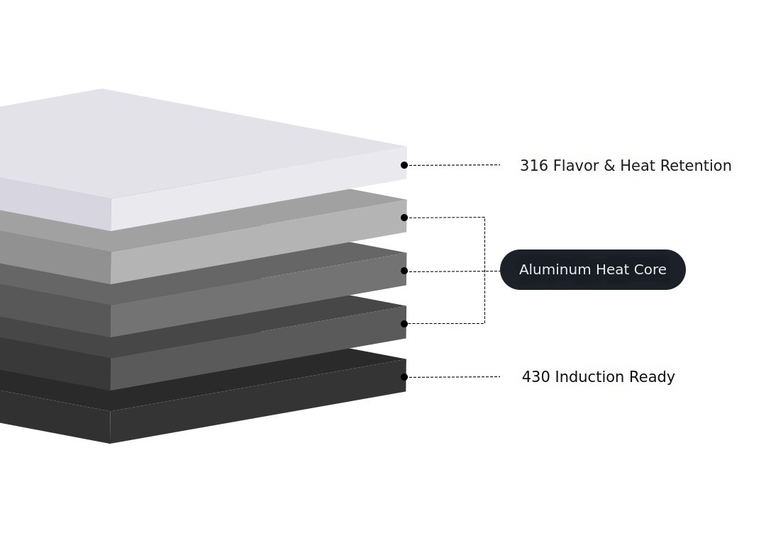 while the outer 430 stainless steel ensures compatibility with induction cooktops.