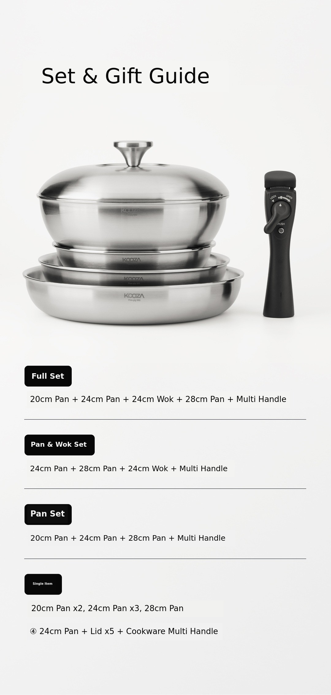 Four types of pans and a convenient multi-handle,