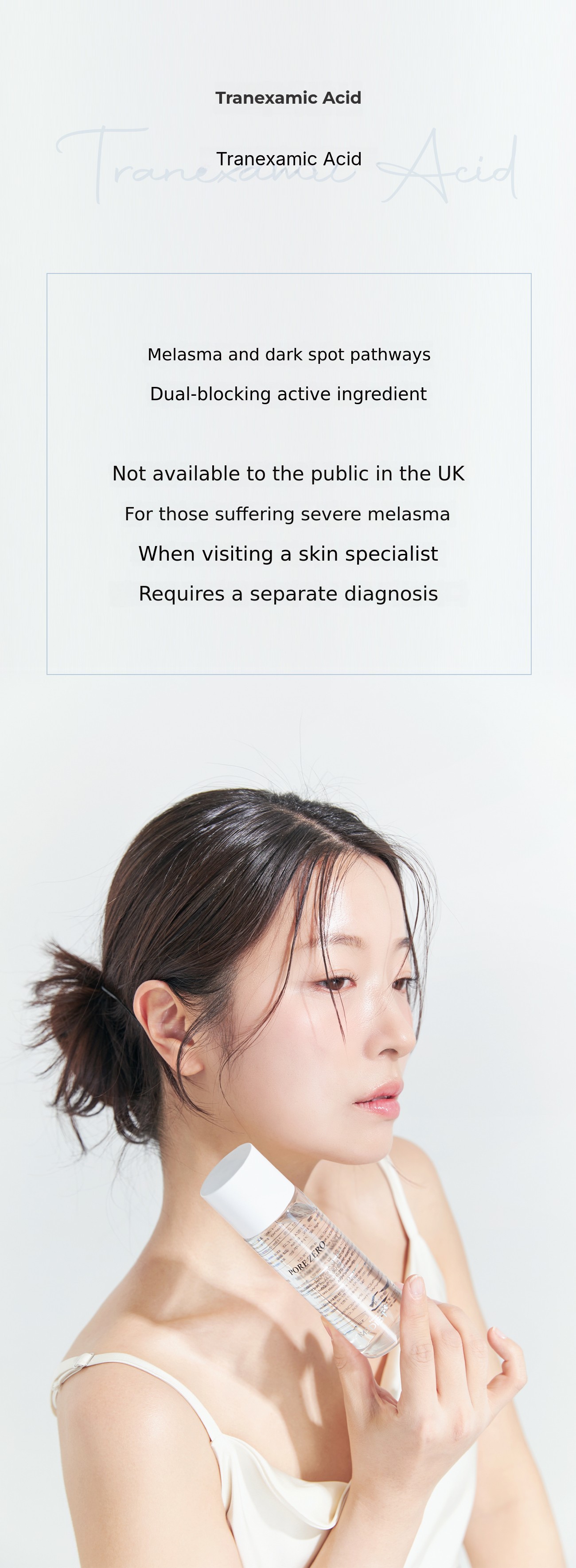We have blended 1% tranexamic acid, equivalent to 10,000ppm, into the pearl essence. Of course, not only tranexamic acid but all other synergy ingredients will also be introduced in percentage units.