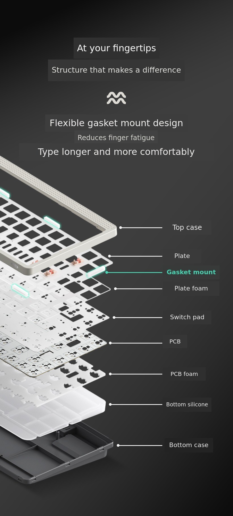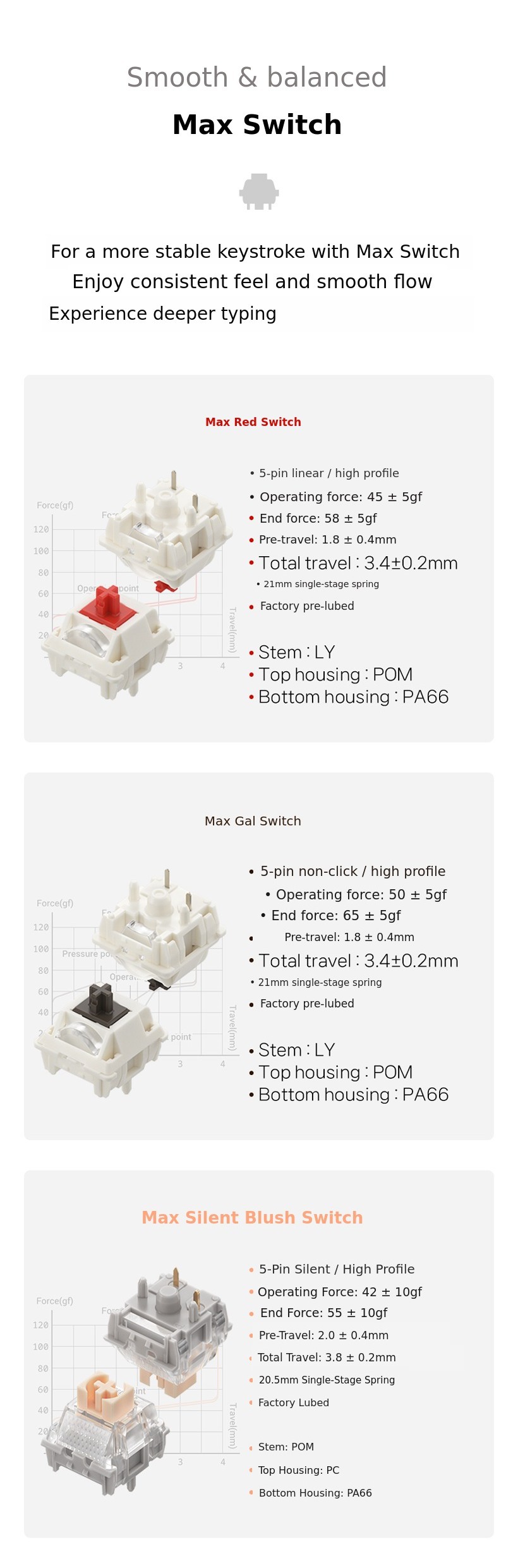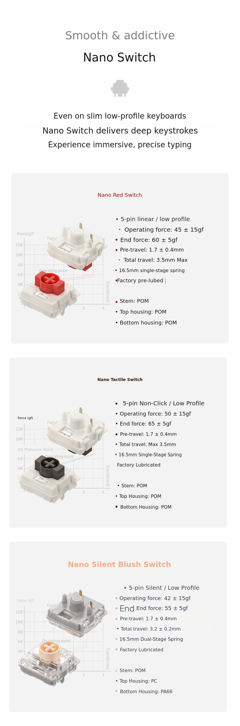 The NODE series is equipped with NuPhy Nano / Max switches, independently developed by NuPhy, allowing you to experience the unique typing feel of each switch. With the ultra-quiet Blush switch that supports very silent typing, you can enjoy typing with NODE even in office environments.