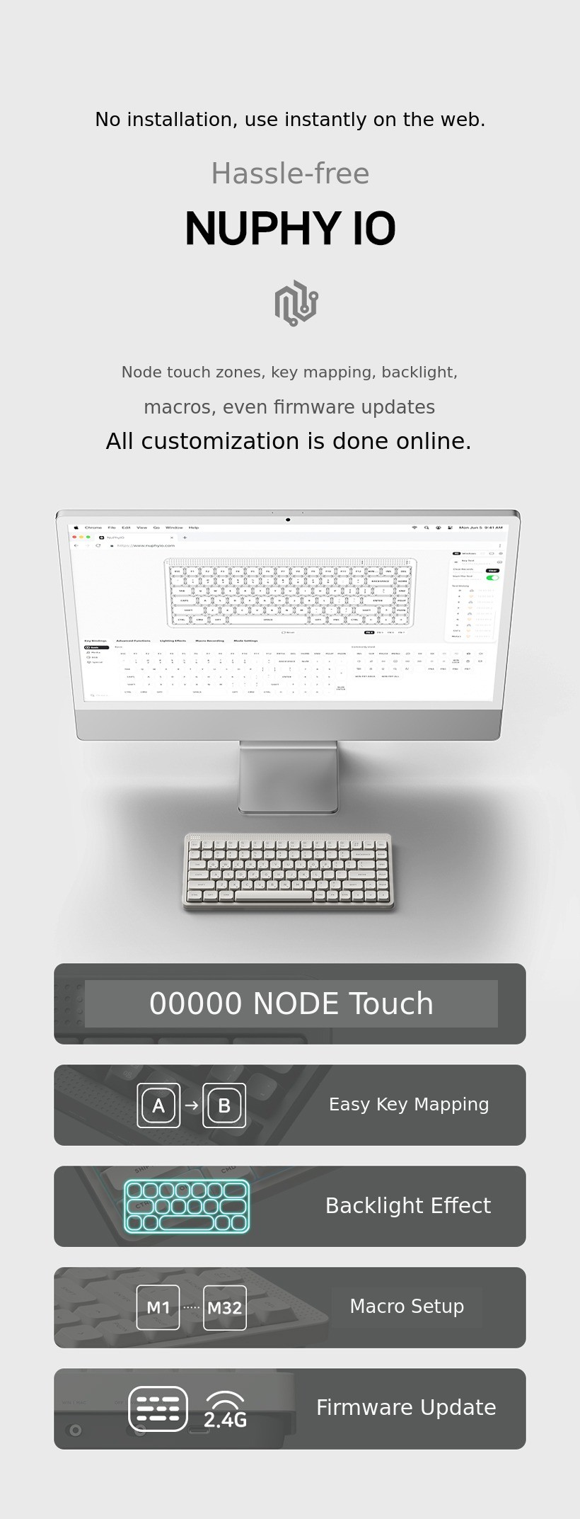 The NODE series uses the exclusive NUPHY IO web dashboard. Therefore, without any separate installation, you can access NUPHY IO via a web browser and use various key mapping functions, macros, firmware updates, and more. The web dashboard can be accessed through the provided link.https://nuphy.io/