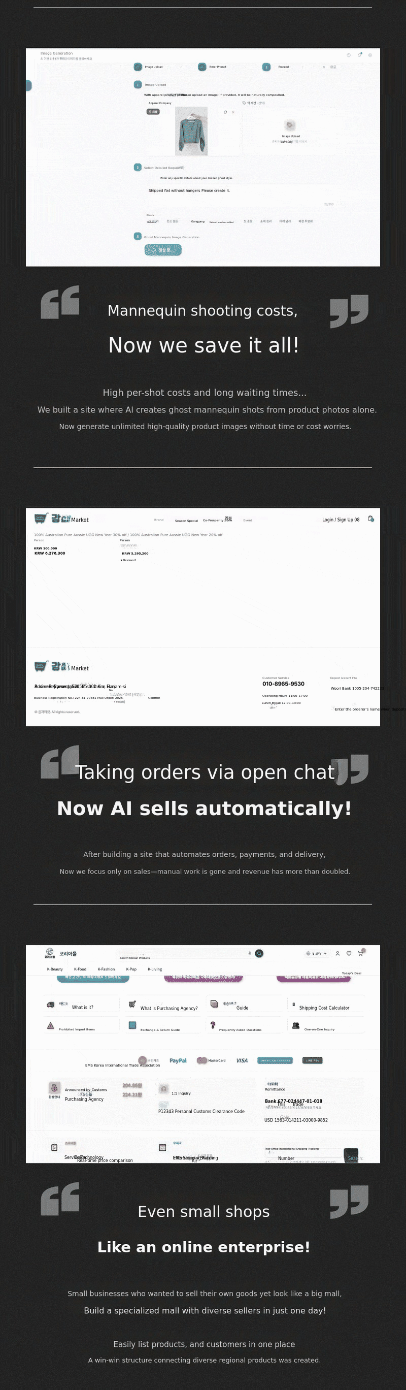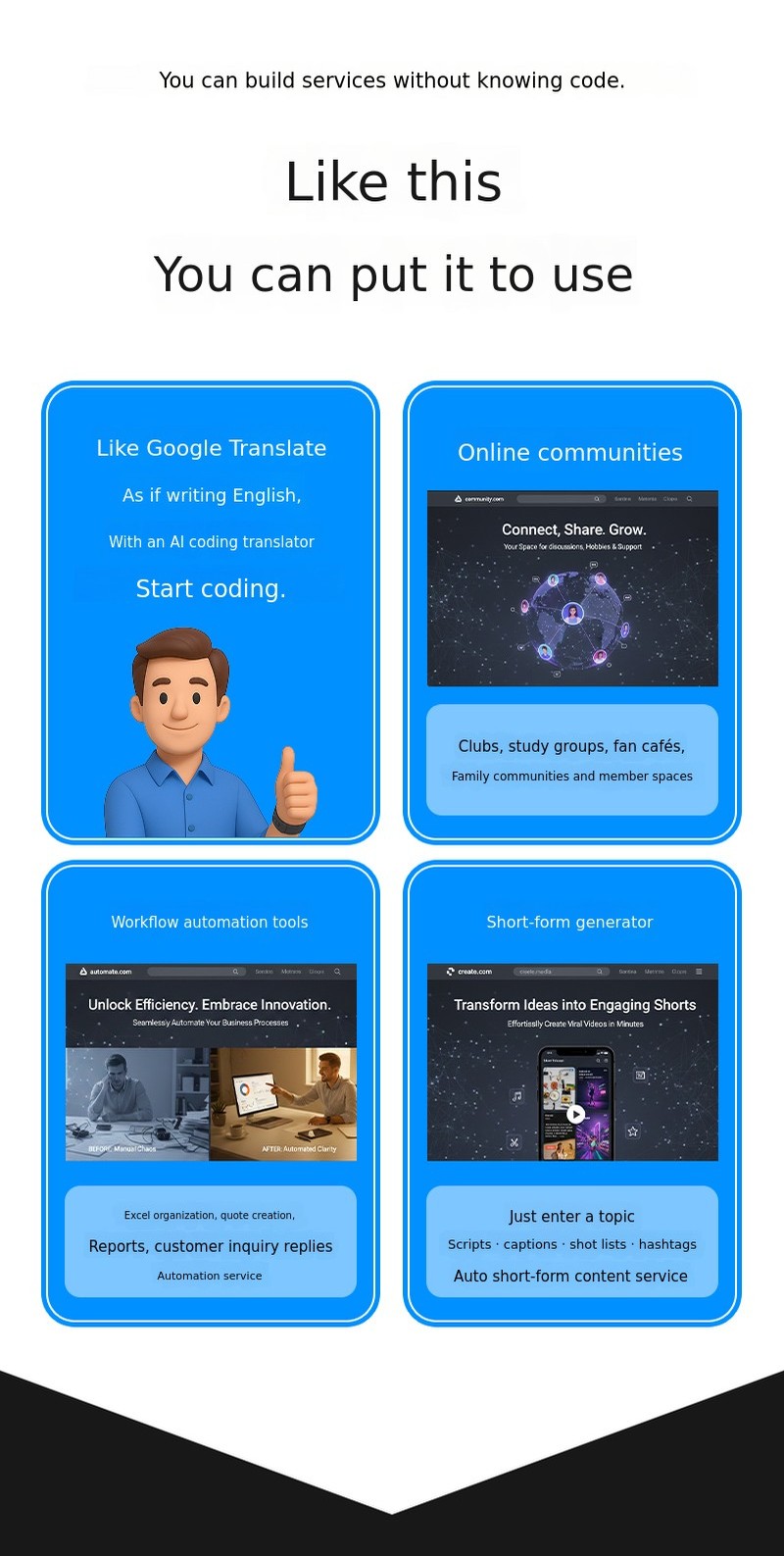 Without complex programming languages or UI/UX design knowledge, you simply talk about the service you want to create, just like a normal conversation.. For example, if you say "I want to build an online gallery site to sell my artwork," the AI understands the intent and proposes and builds the following program structure.