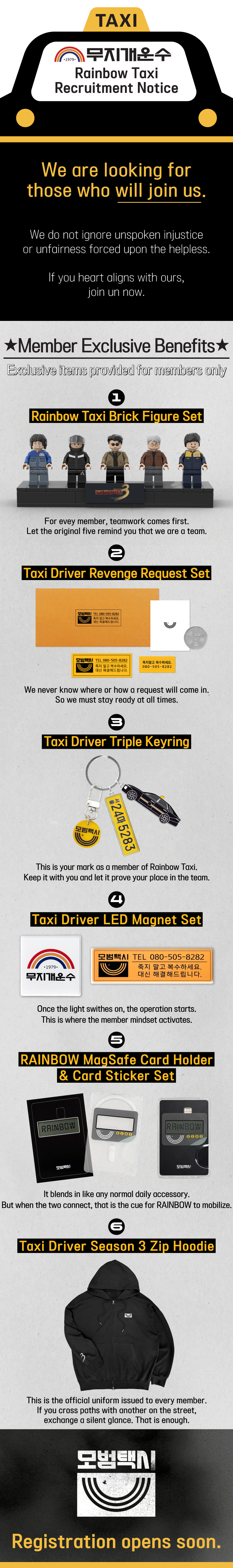 We have turned the iconic symbols of Taxi Driver, beloved by fans through Season 3, into goods that you can actually use and keep for a long time. Now, Taxi Driver is no longer just in the dramaโ€”it will be with you in your everyday life.