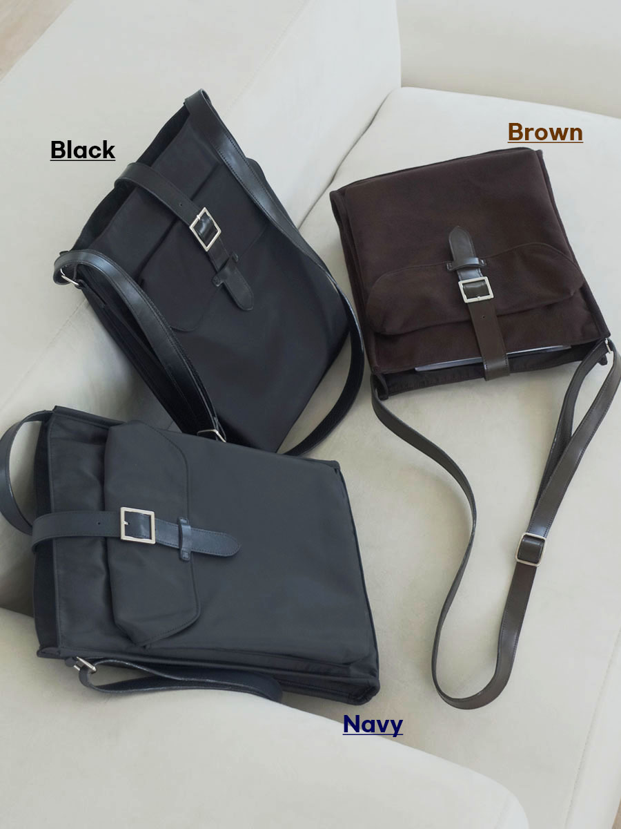 The Neatly Square Crossbody Bag comes in three colors: black and navy made from nylon fabric, and brown made from suede fabric.