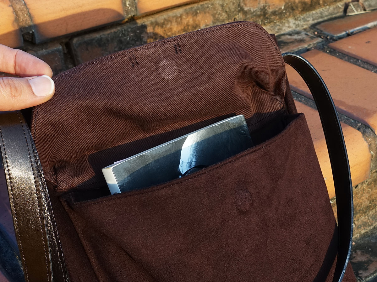 โฒ The pocket is fitted with a flap (the pocket's lid) that matches its three-dimensional shape, and can be secured twice with a magnetic button and the main leather strap, keeping your belongings safe.