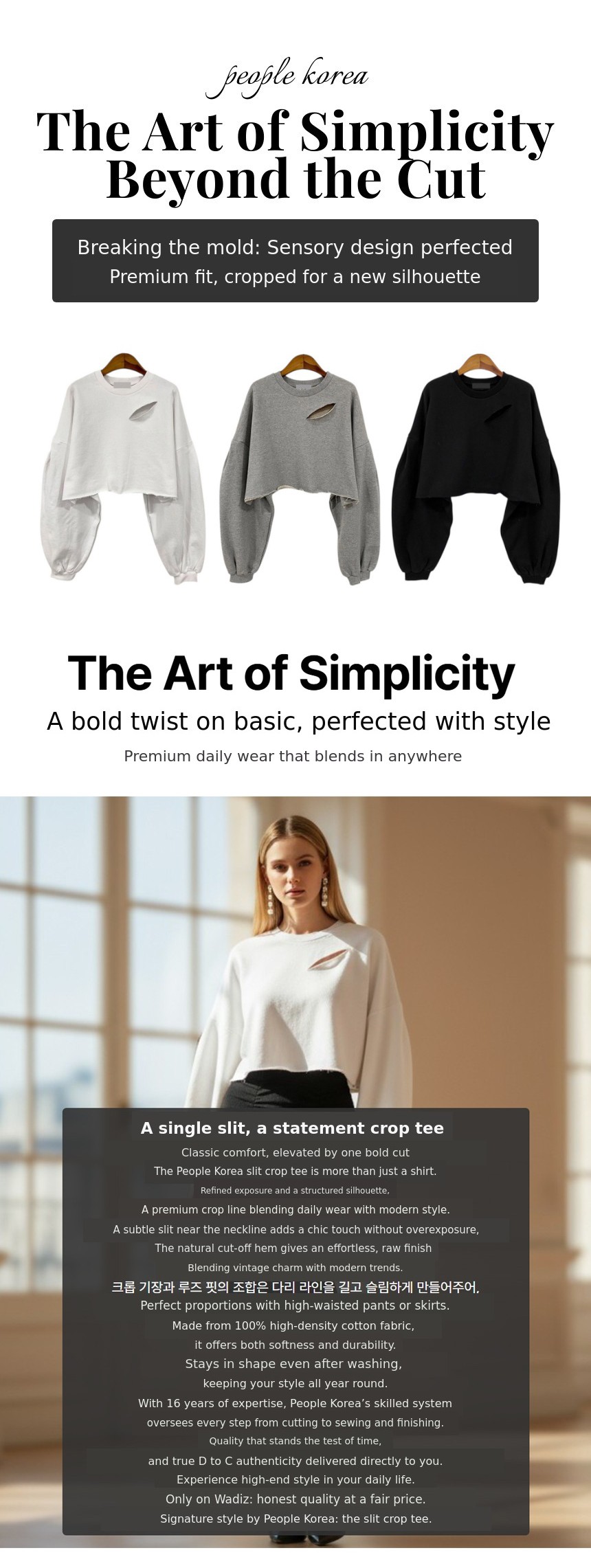 1. 👚 Slit Crop Tee Design - Refined slit and loose fit create a sophisticated crop top 2. 🌿 Comfortable Fit and Quality - 100% cotton fabric offers soft and durable wear 3. 🎁 Exclusive Crowdfunding Price - High-end daily wear offered at a special price