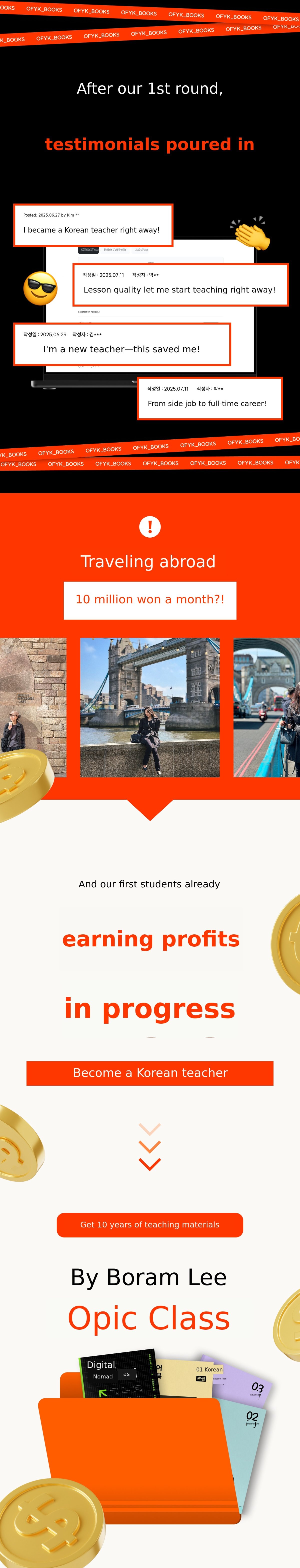 OFYK_Books is a publishing company founded by Boram Lee, who has years of experience at universities in Seoul, online, and on YouTube, and is known for her teaching skills. The company creates Korean teacher debut consulting & bootcamps. Along with various instructors and team members, we lead lectures in the bootcamp to support your digital nomad life. We aim to help you start your second life with truly rich and valuable resources.