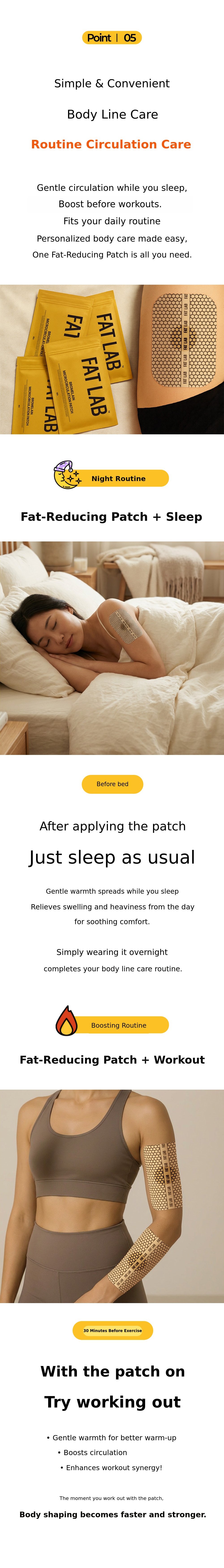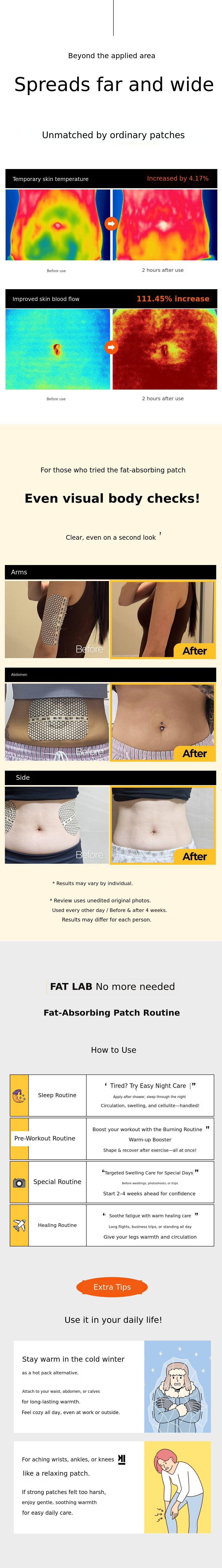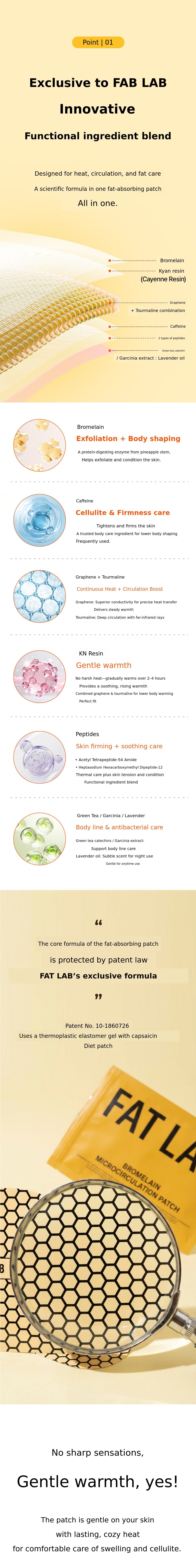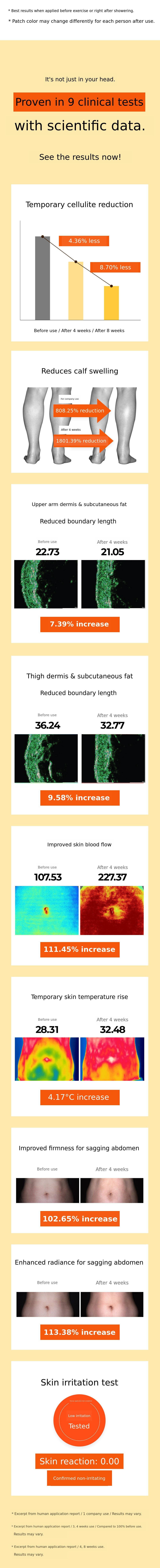 To turn this principle into a daily routine, we repeated sampling and clinical trials for 30 months, resulting in the creation of the Bromelain Thermal Circulation Patch and the Fat-Absorbing Patch.