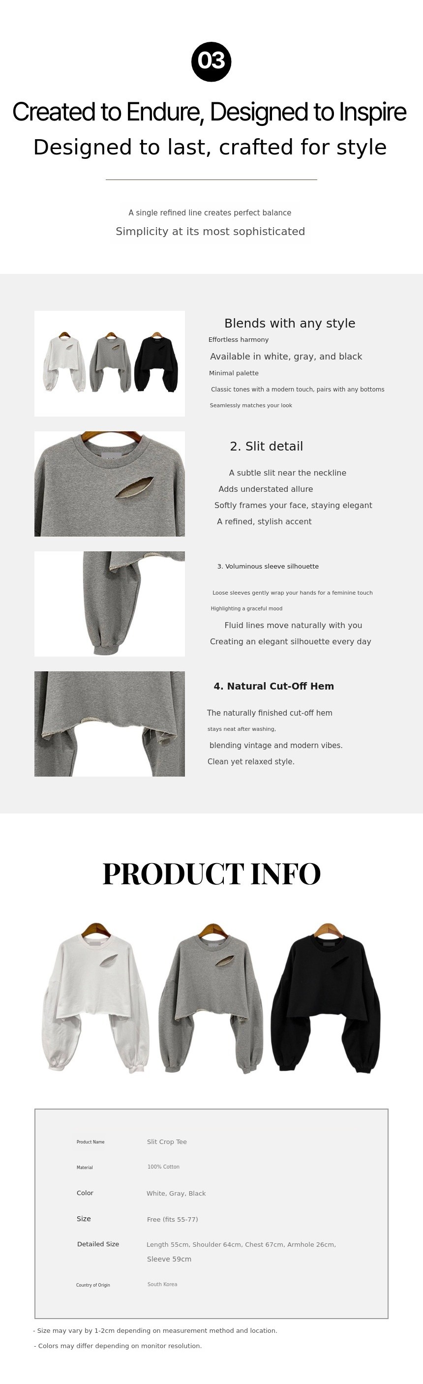 1. 👚 Slit Crop Tee Design - Perfect proportions with restrained slit and loose fit 2. 🌿 High-Density Cotton Fabric - Soft, firm feel delivering a refined silhouette 3. 🎁 Exclusive Reasonable Price - Honest quality directly from manufacturer on platform