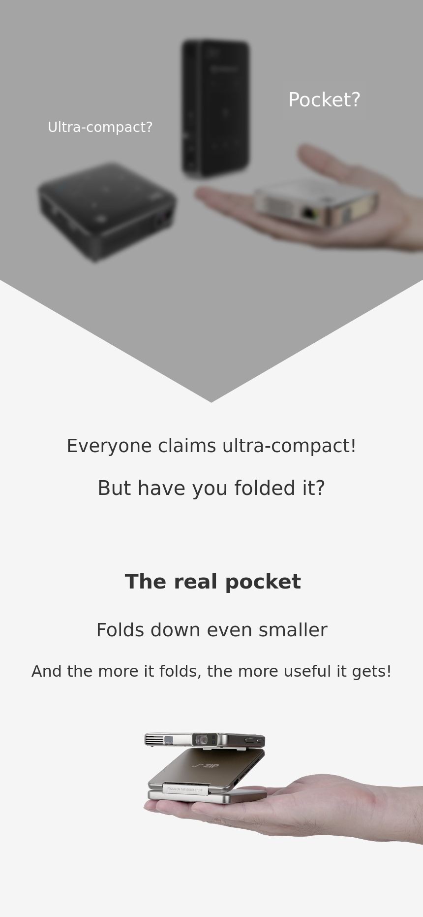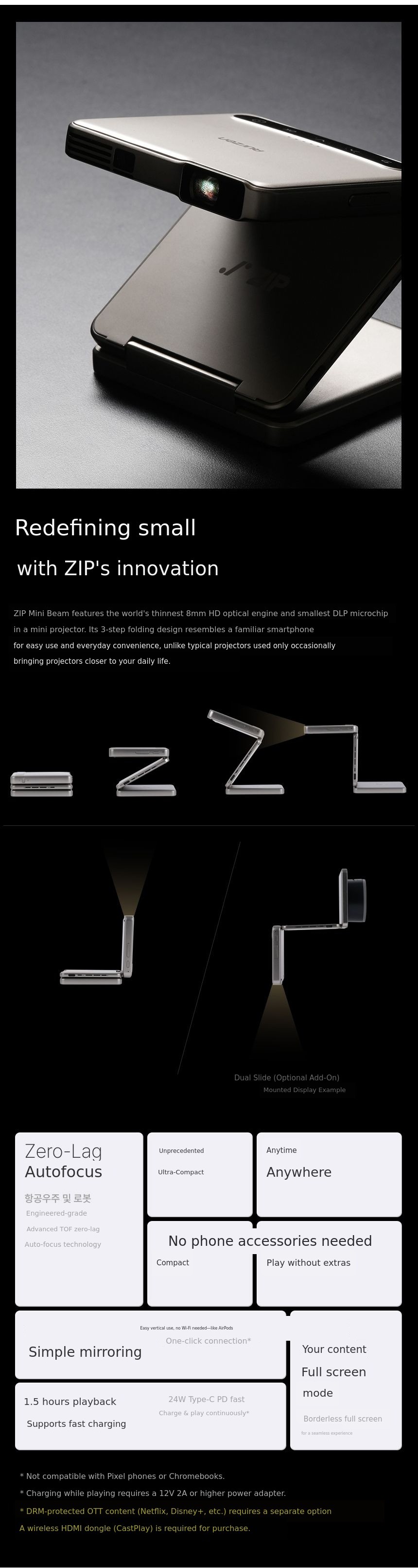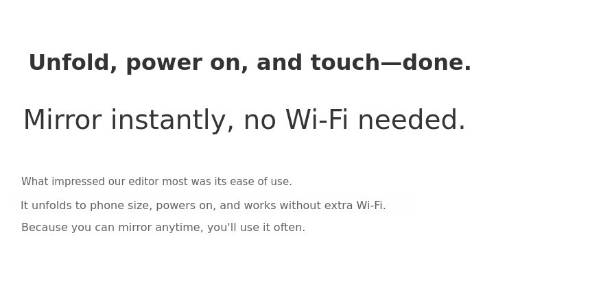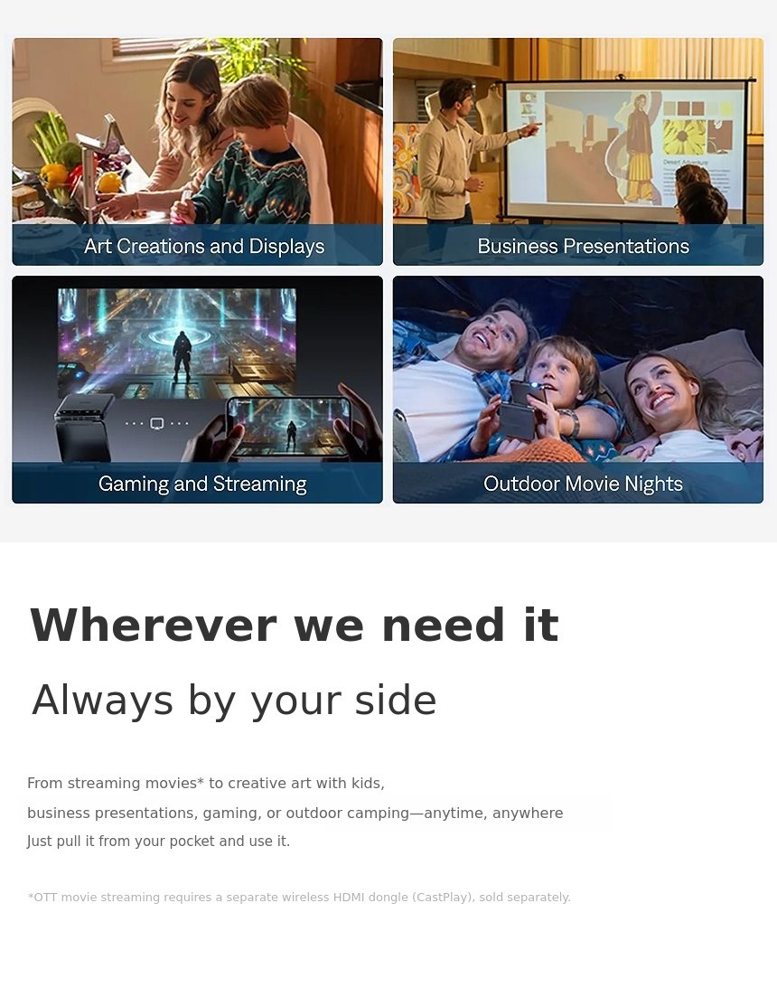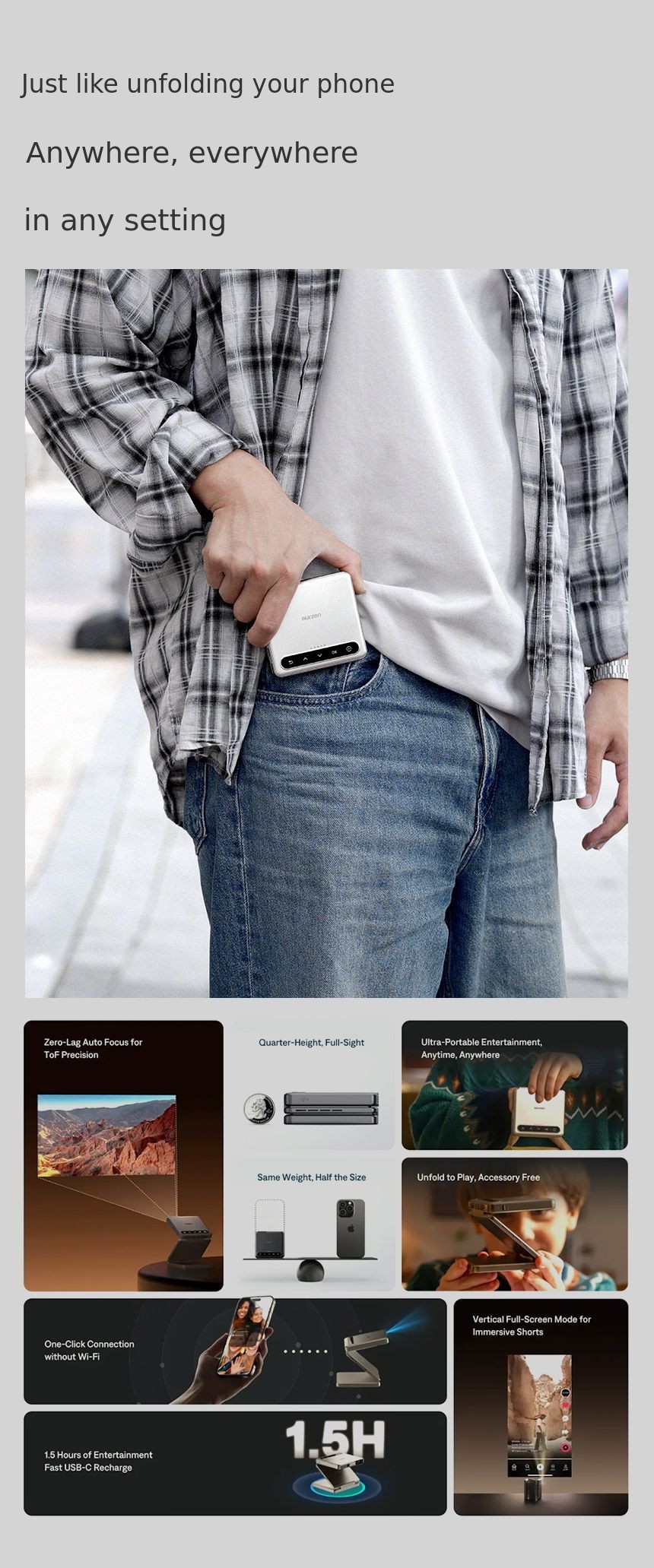 1. 📽️ Ultra-compact Tri-fold Projector - Phone-sized mini projector with tri-fold design for portability 2. ⚡ Easy Use and Fast Charging - One-click mirroring, 1.5-hour playback, supports 24W fast charging 3. 🎁 Award-winning Design and Exclusive Offer - CES award-winning, metallic finish, exclusive crowdfunding benefits
