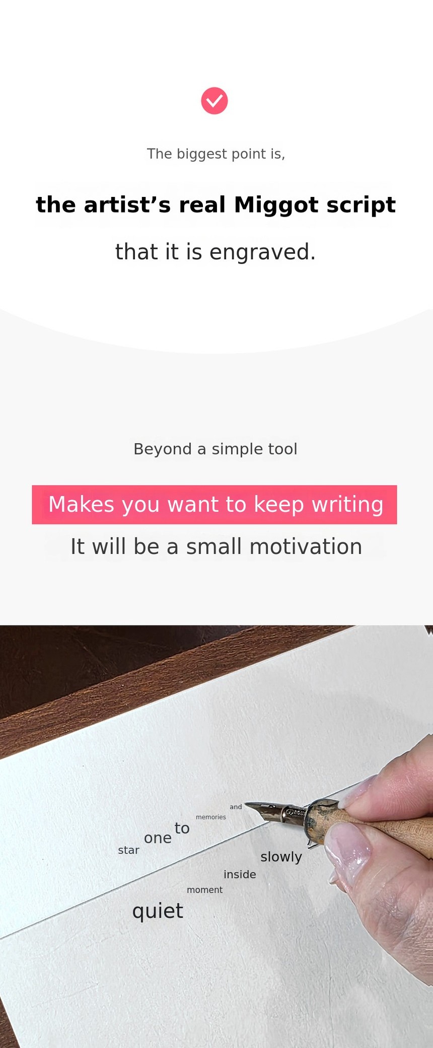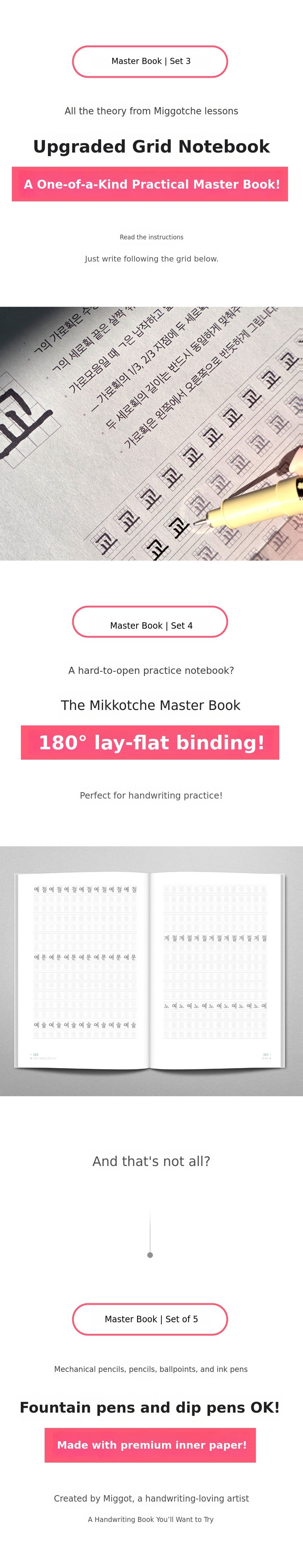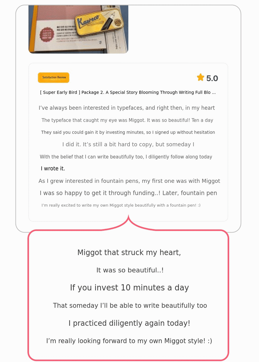 A. Of course! Miggotche is a structurally designed handwriting style created to make Hangul look its most beautiful. Everyone who learns Miggotche is surprised, saying, “It’s much easier than I thought!” To date, over 50,000 people have successfully improved their handwriting with Miggotche.