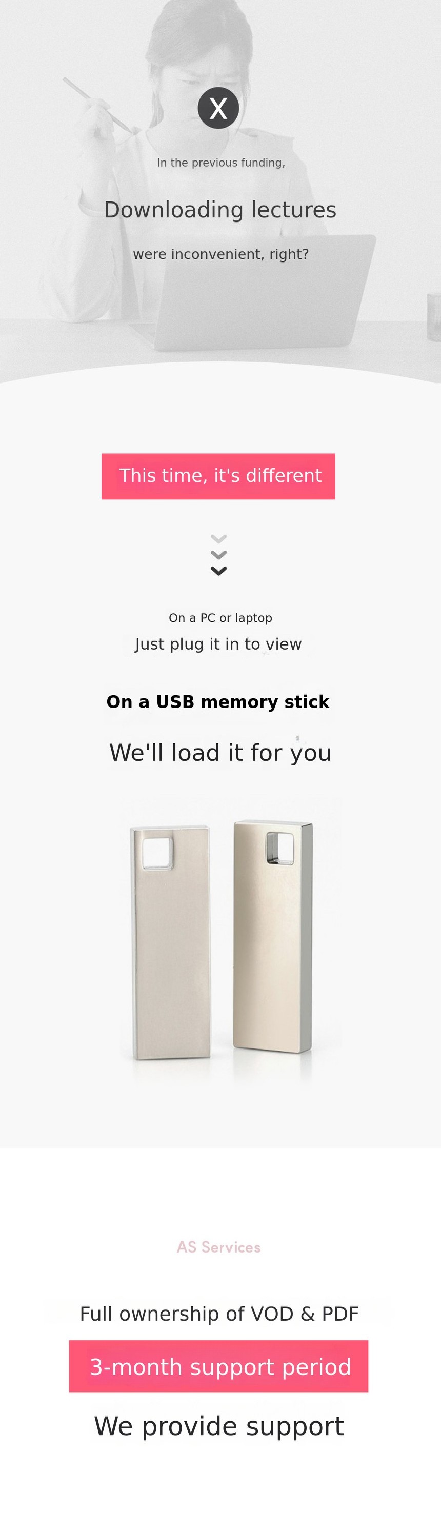 A. Yes! This time, we’ll send them on a USB memory stick, so there’s no need to download anything separately. All the VODs are stored on the USB, so you can just plug it into your PC or laptop and play them immediately. We’ve prepared it so you can watch comfortably anytime without hassle.