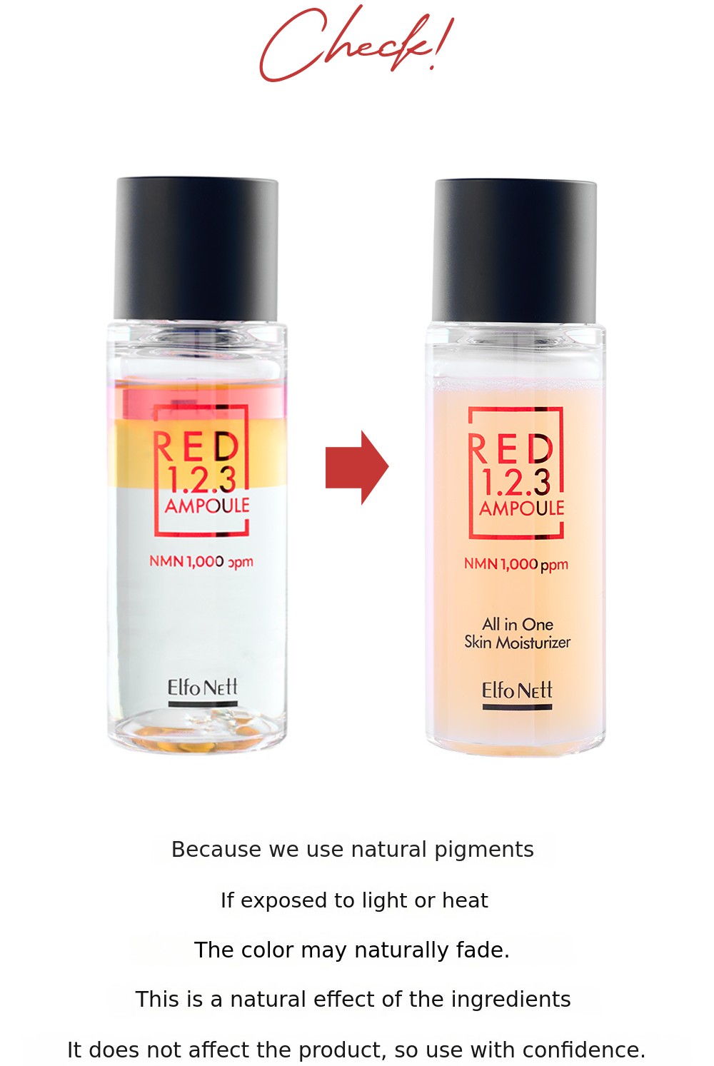 A. No, it has not. The red color of the Red 1.2.3 ampoule oil layer comes from alkanna root, the deep yellow of the essence layer is from lecithin, and the light yellow of the water layer is derived from gardenia. Since all layers reflect the natural colors of their ingredients, it is normal for the color to fade over time. The product is perfectly safe to use, so please use it with confidence.